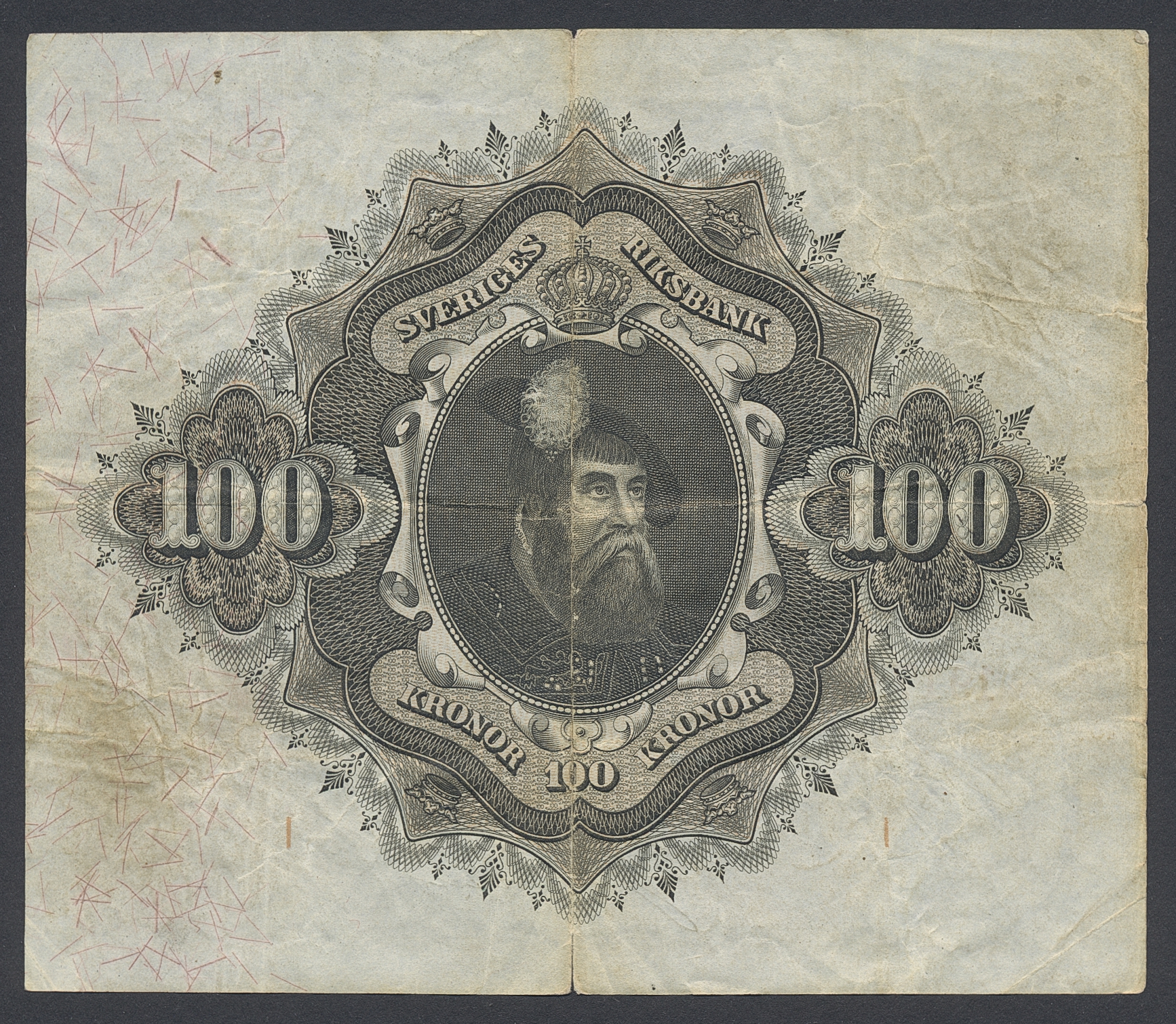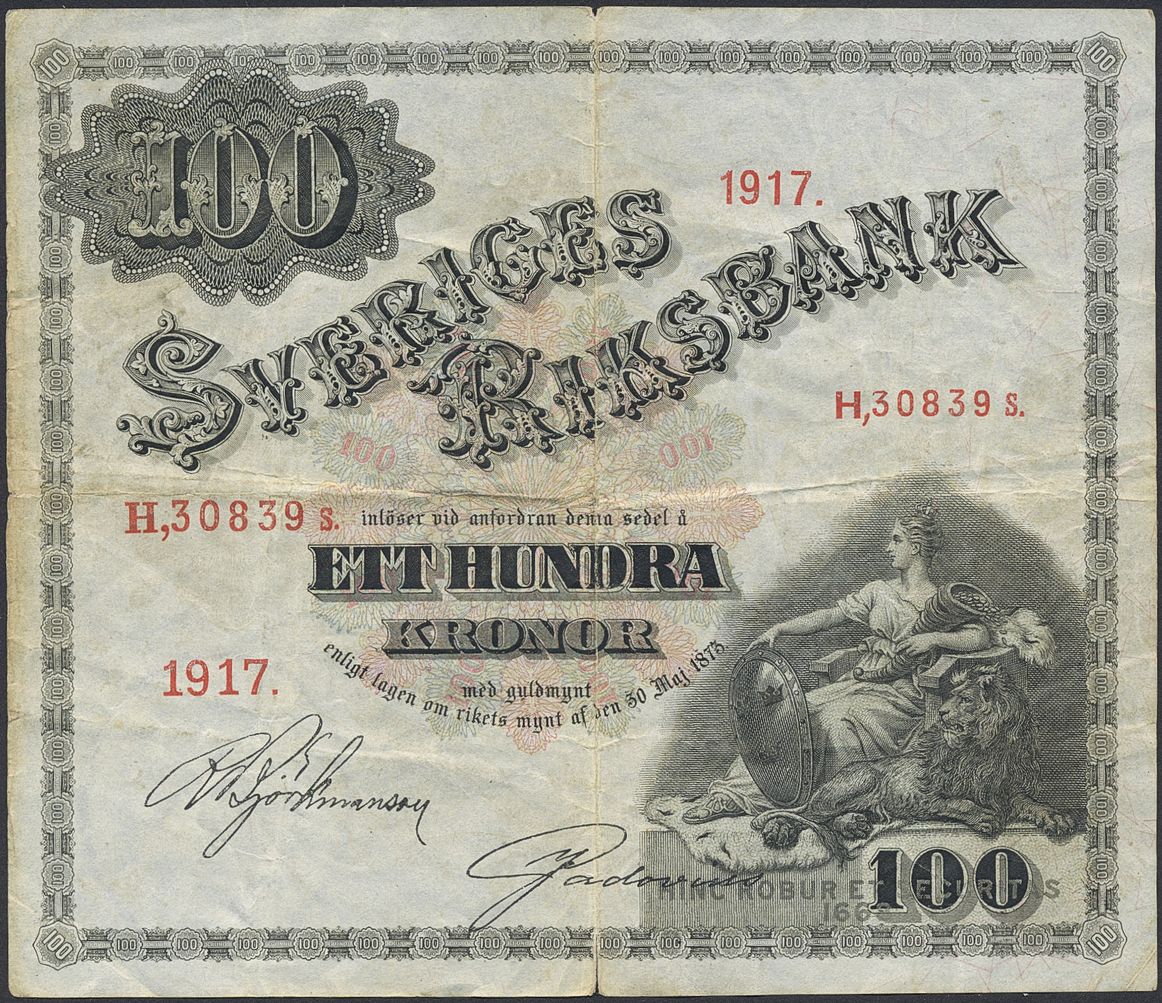 Banknotes, Sweden. SF U7:11, 100 kronor 1917. H,30839s. Small tears in centre fold. 1?/1.