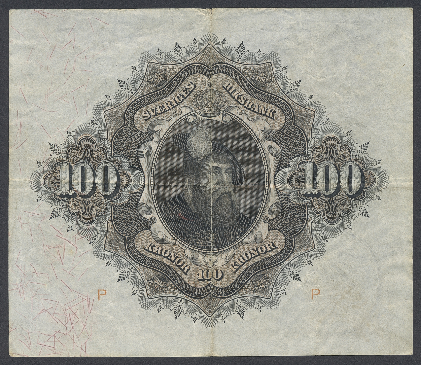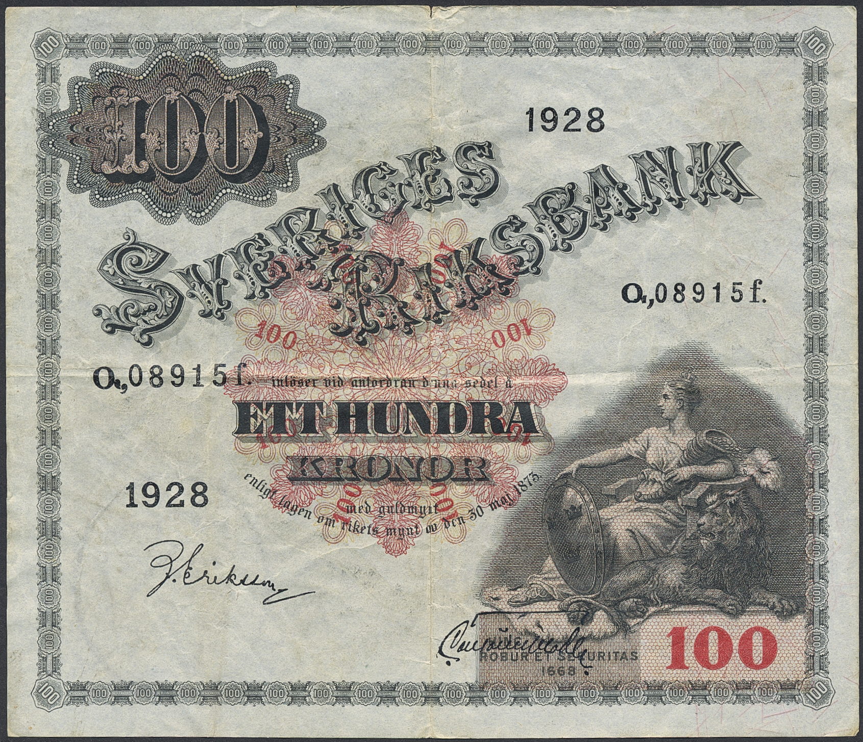 Banknotes, Sweden. SF U8:11, 100 kronor 1928. Small two mm tear in centerfold. 1.