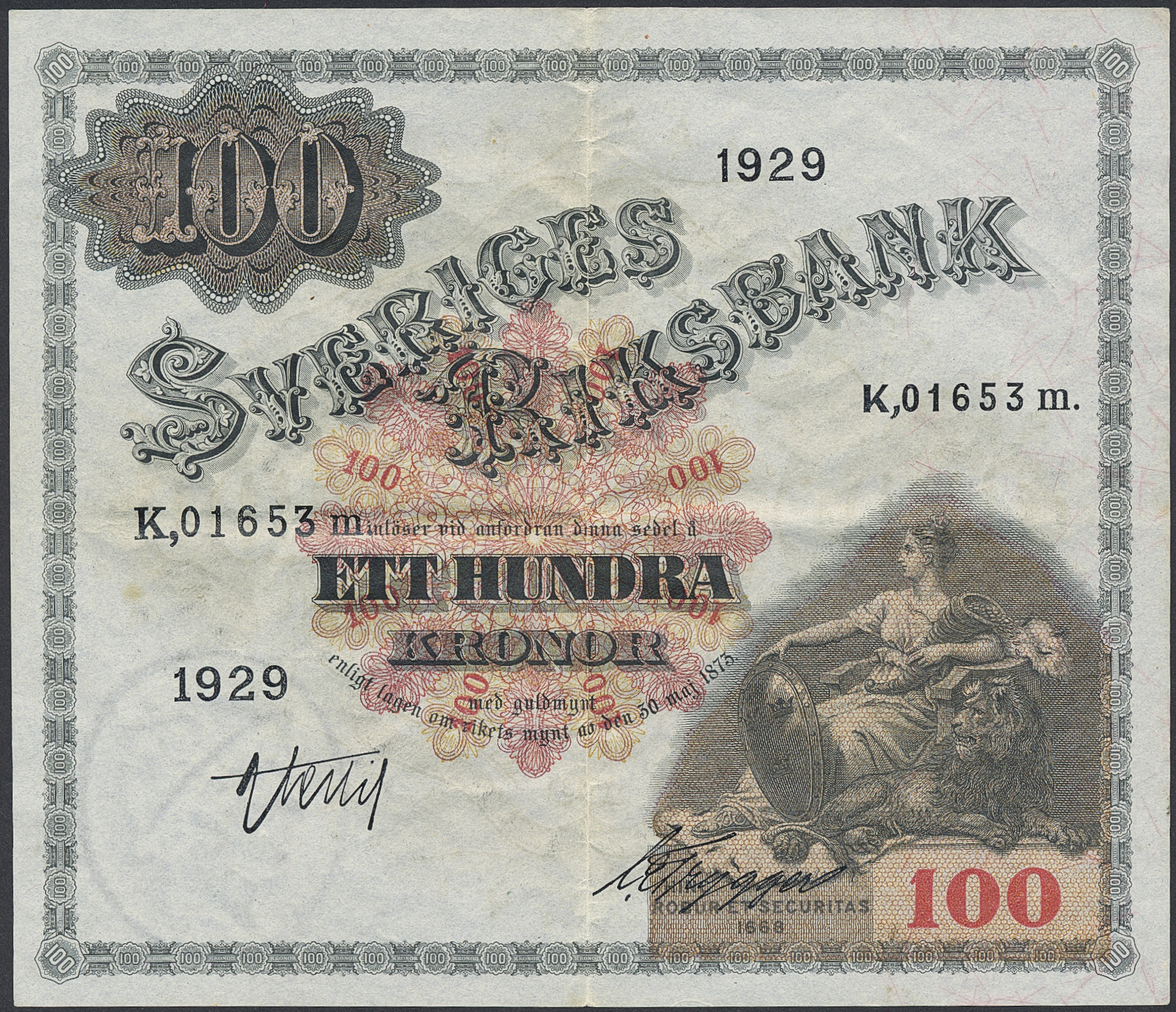 Banknotes, Sweden. SF U8:12, 100 kronor 1929. 1+.