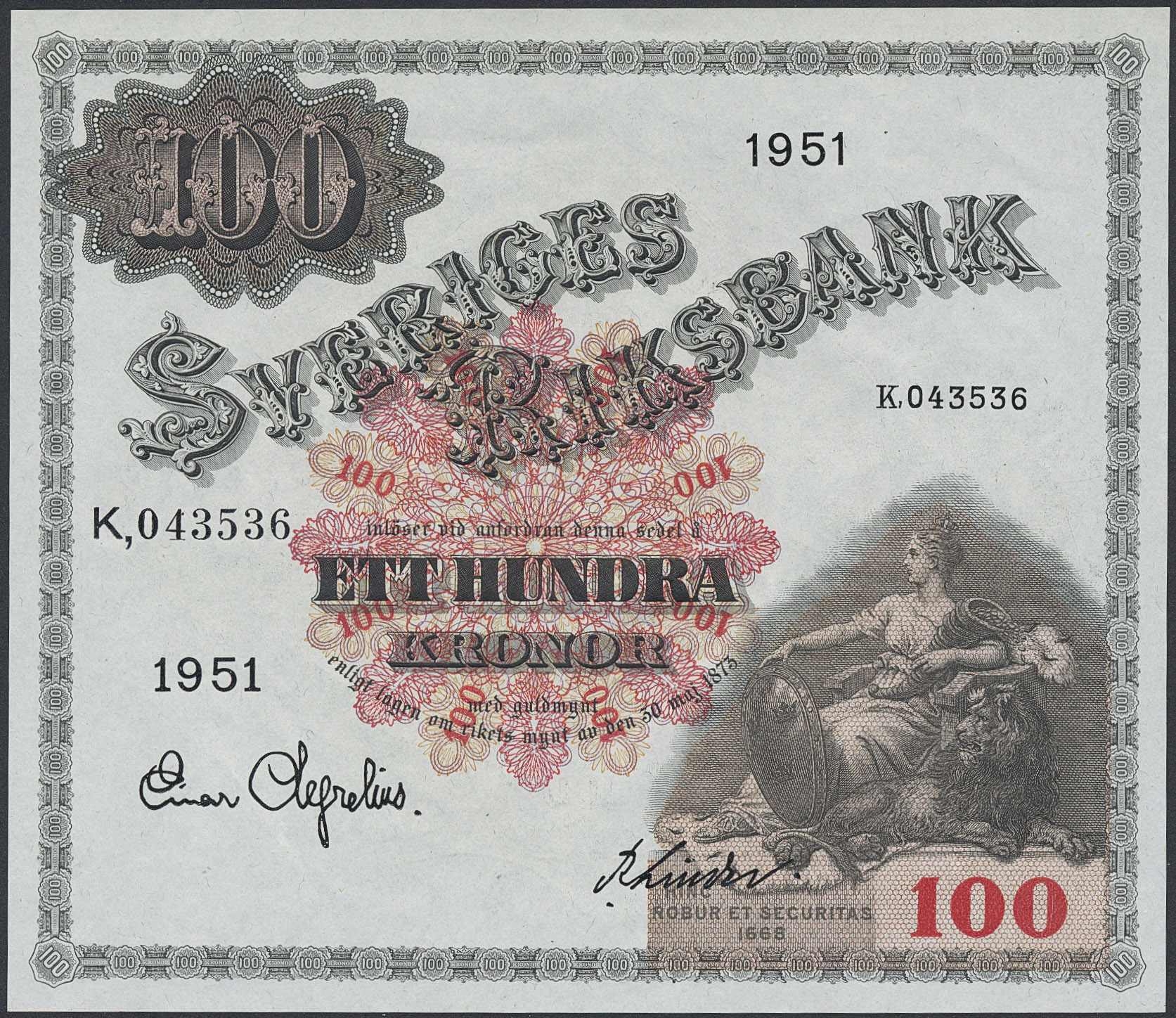 Banknotes, Sweden. SF U10:5, 100 kronor 1951. K043536. Not folded. Minor handling marks. 01/0.