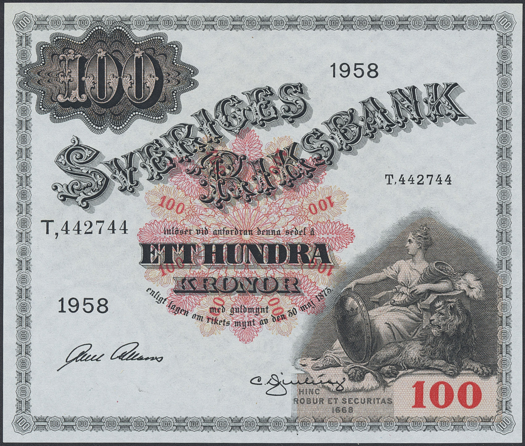 Banknotes, Sweden. SF U10:14, 100 kronor 1958. T442744. Not folded. Minor handling marks. 01/0.