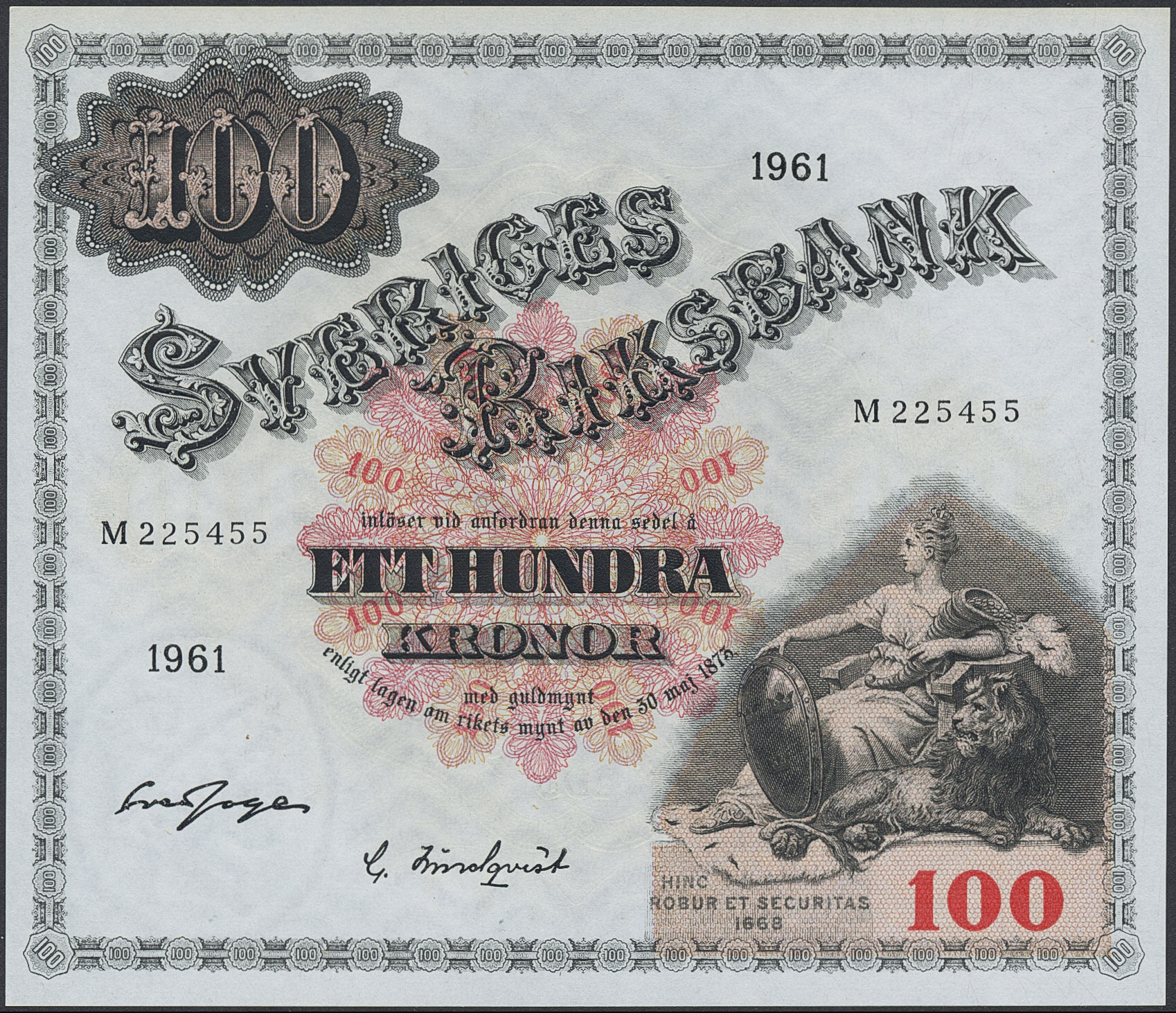 Banknotes, Sweden. SF U11:4, 100 kronor 1961. M225455. Not folded. Minor handling marks. 01/0.
