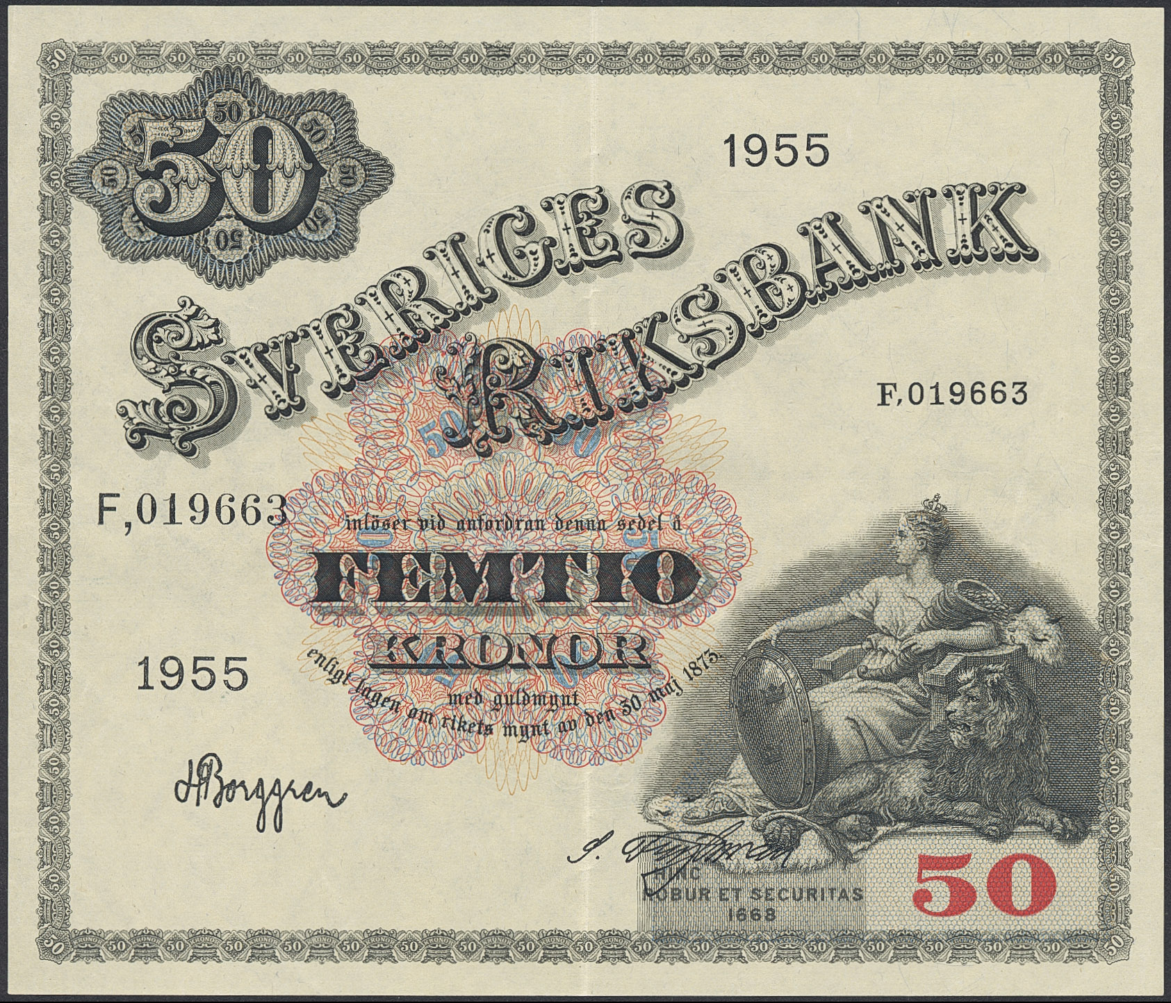Banknotes, Sweden. SF T9:6, 50 kronor 1955. F019663. Light centre fold. 01.