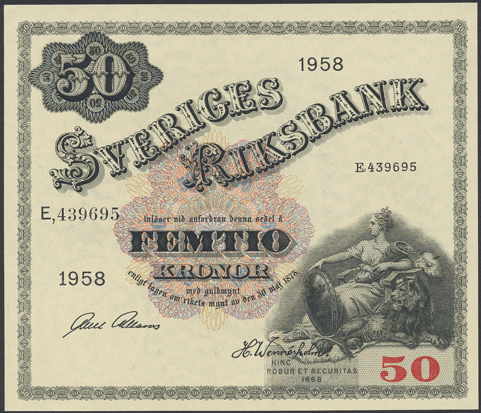 Banknotes, Sweden. SF T9b:11, 50 kronor 1958. Not folded. 01/0.