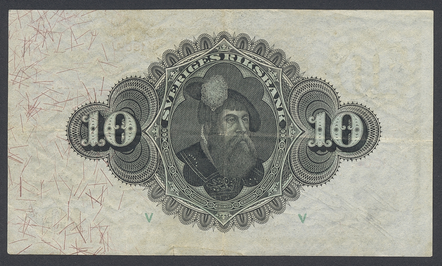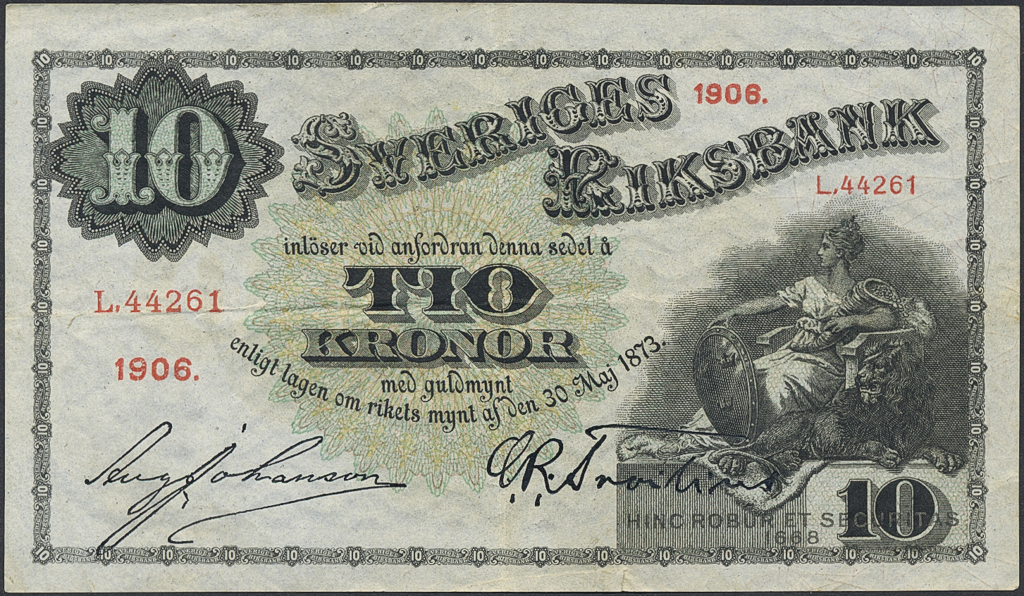 Banknotes, Sweden. SF R4:1, 10 kronor 1906. Small 3 mm tear. 1/1+.