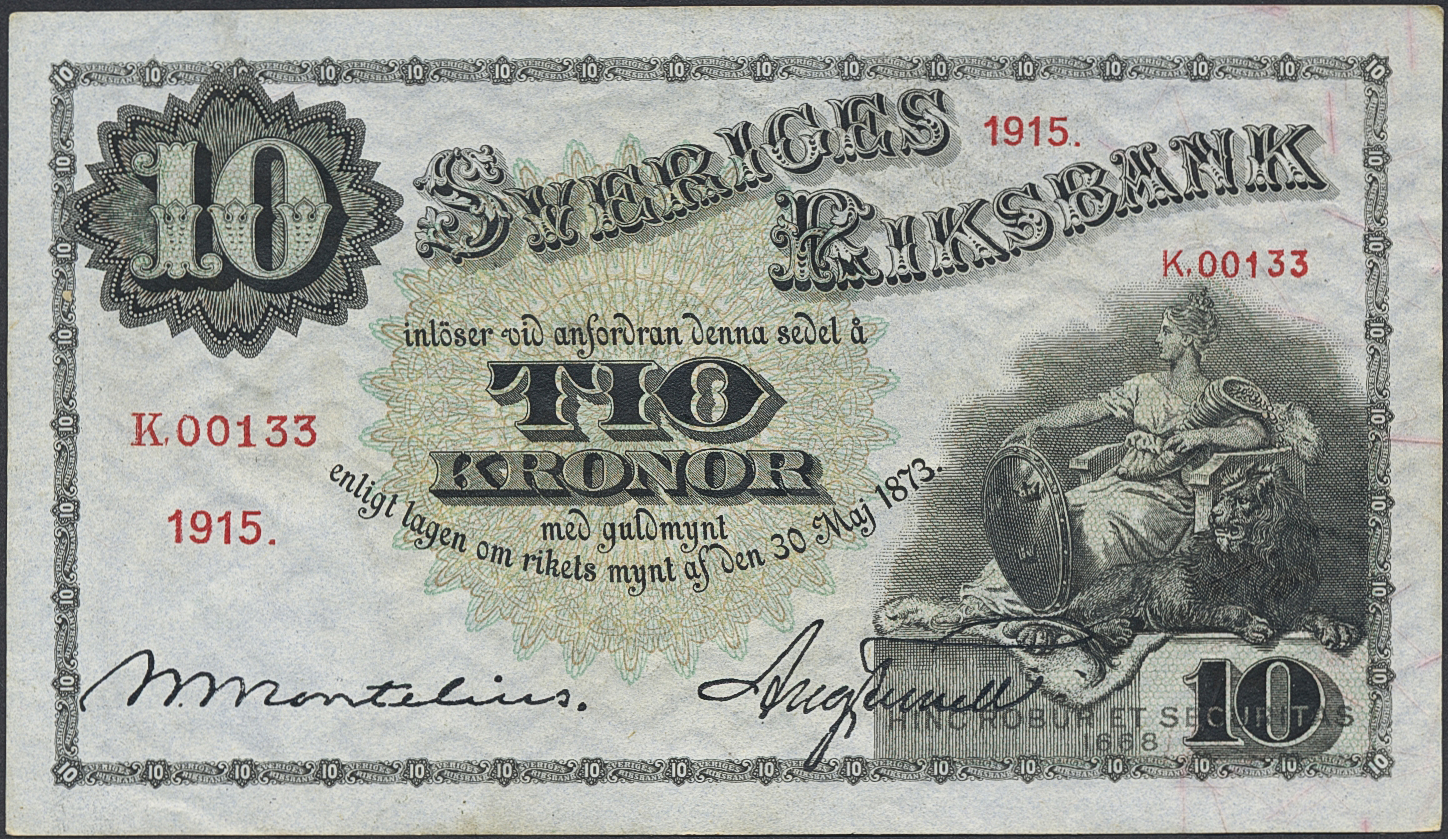 Banknotes, Sweden. SF R4:10, 10 kronor 1915. Low serial number. K00133. 1+/01.