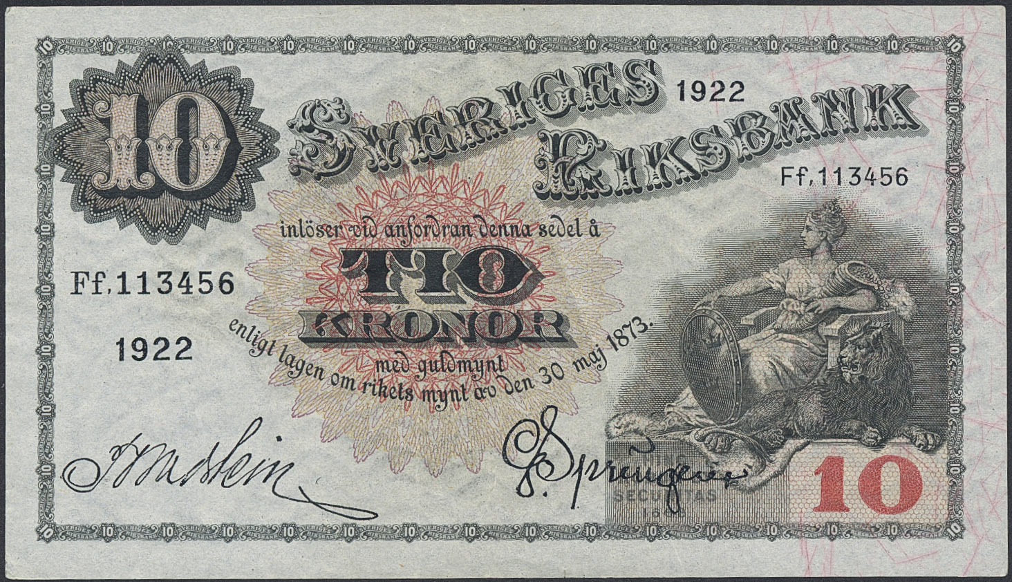 Banknotes, Sweden. SF R5:5, 10 kronor 1922. Ff113456. 1+.