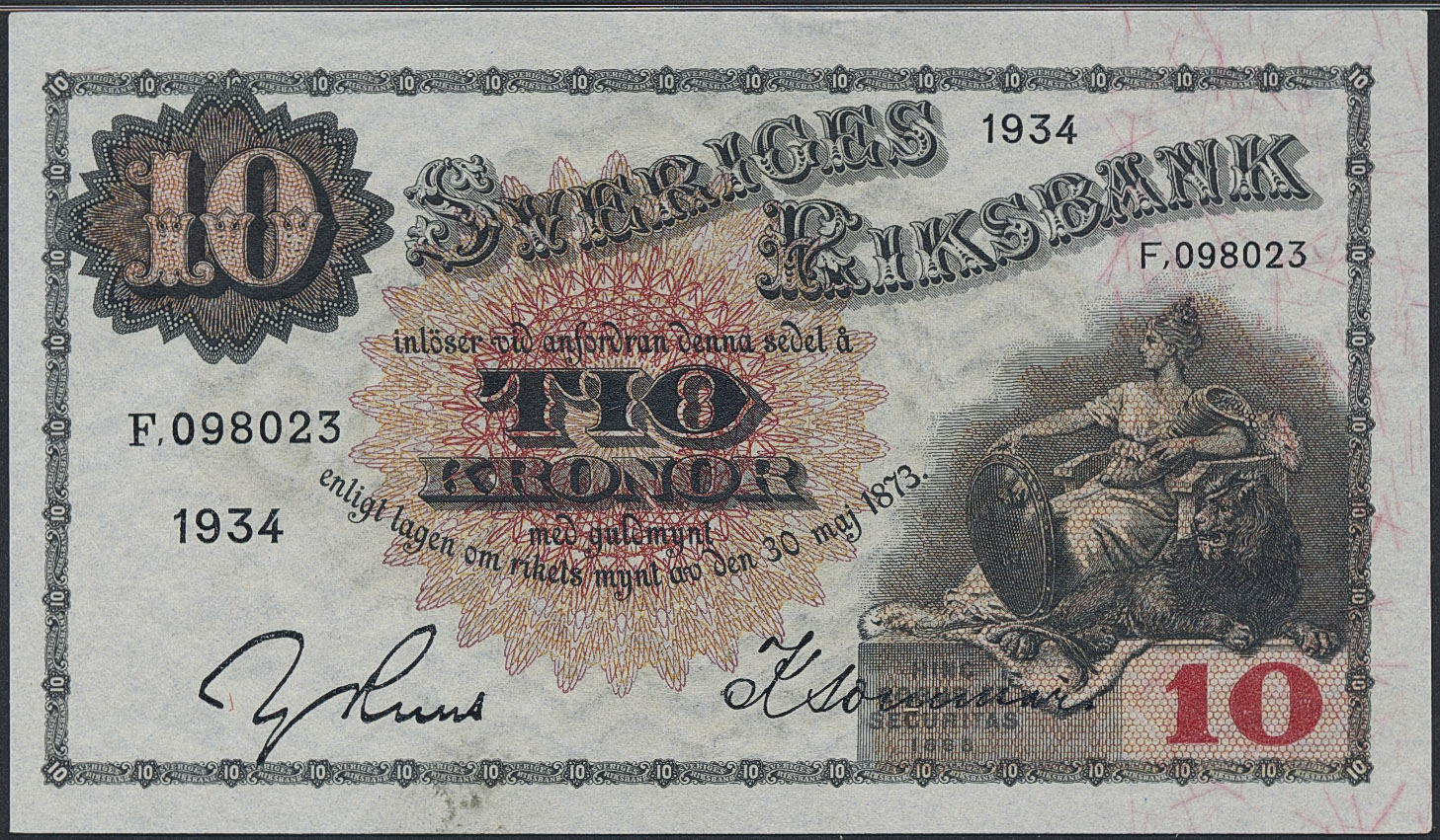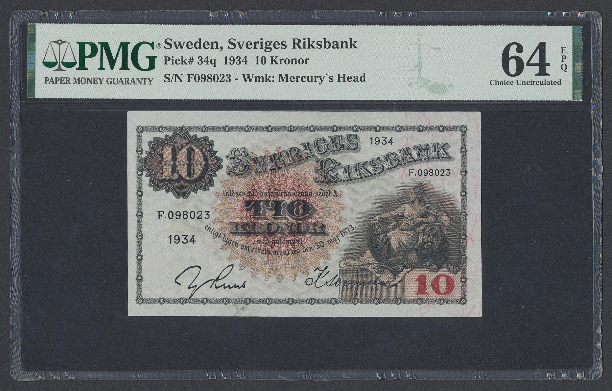 Banknotes, Sweden. SF R5:17, 10 kronor 1934. F098023. Graded by PMG as Uncirculated 64 EPQ. Pick 34q. 01/0.
