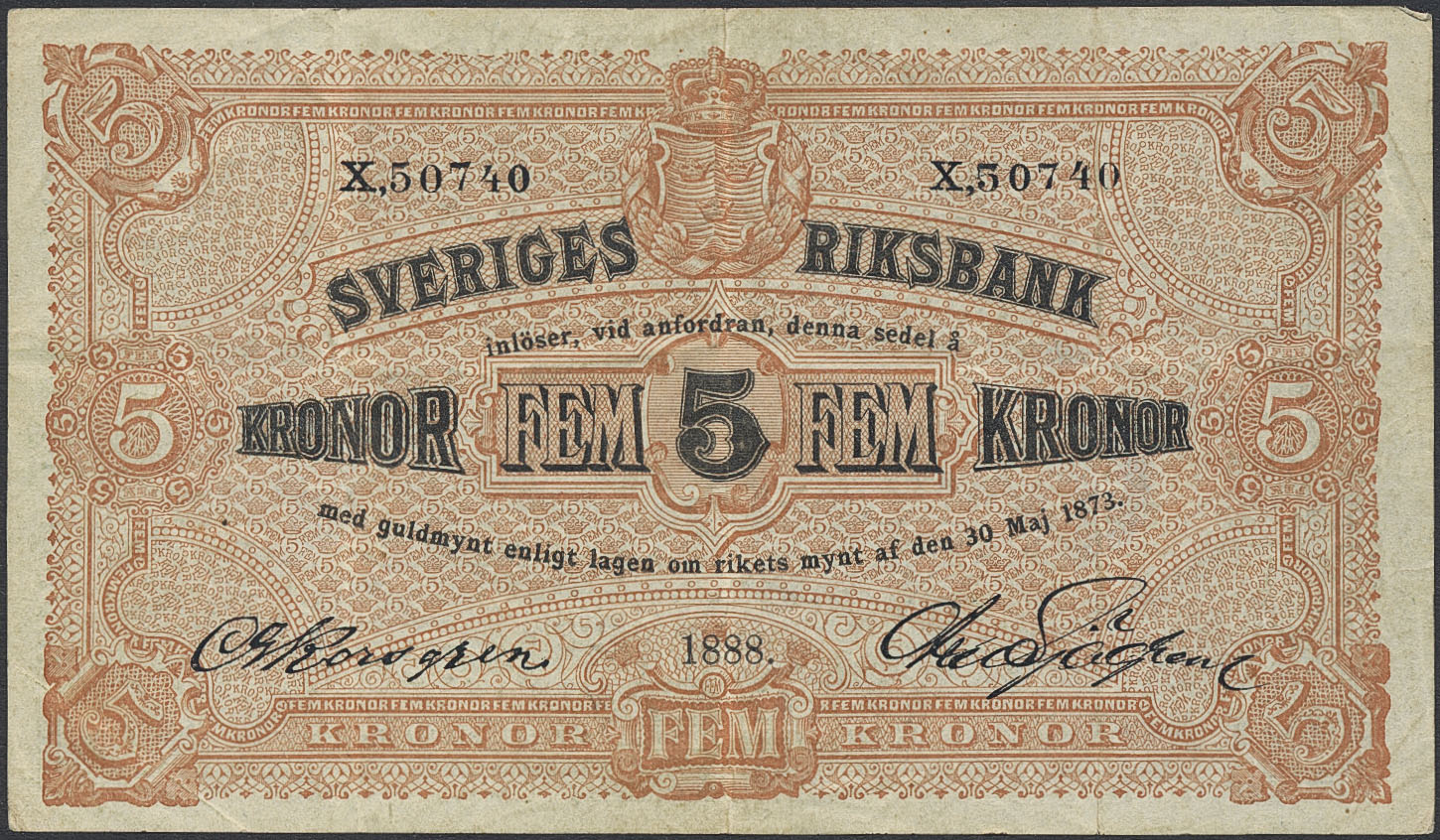 Banknotes, Sweden. SF Q3:10, 5 kronor 1888. No: X 50740. 1+.