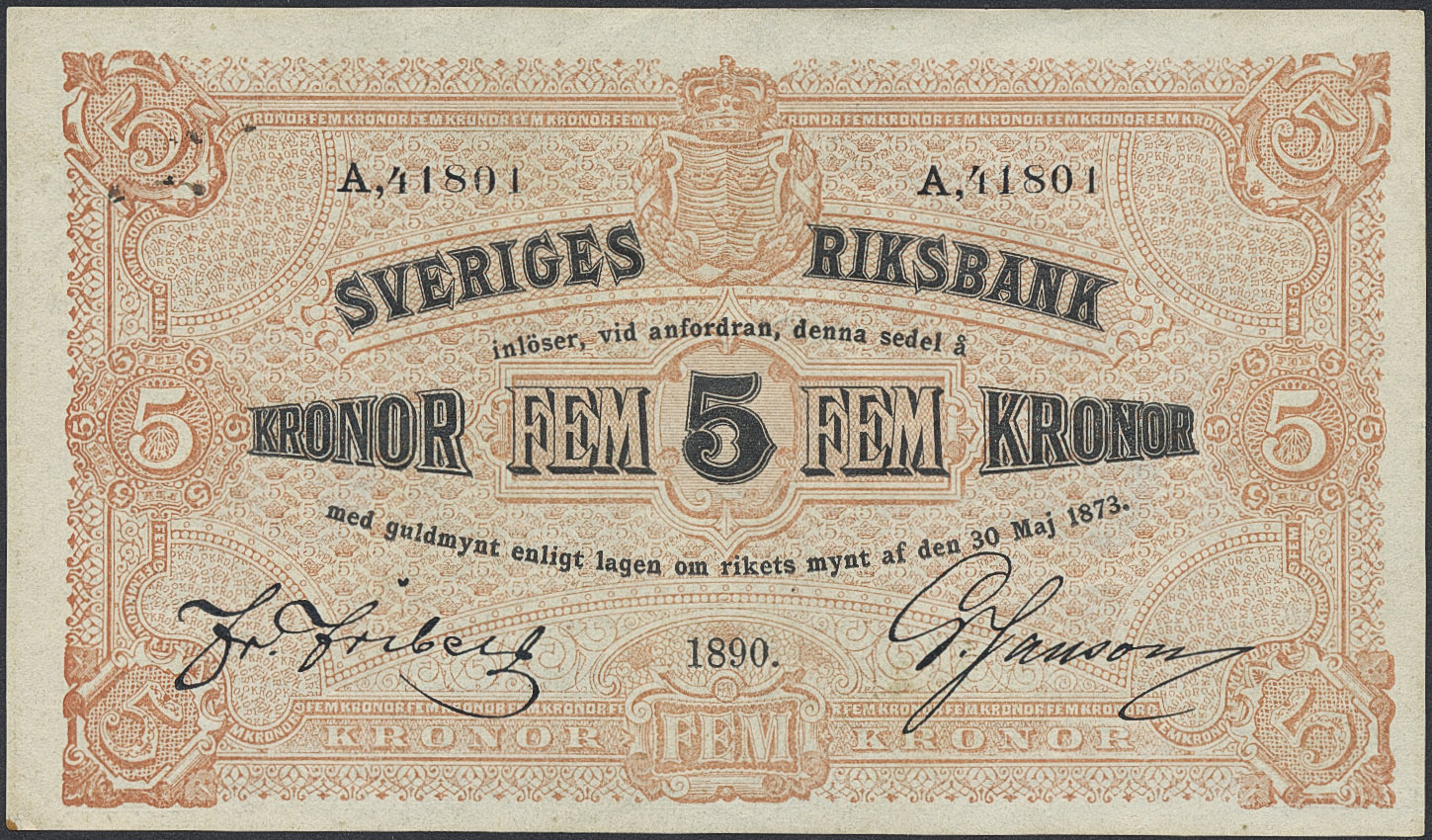 Banknotes, Sweden. SF Q4:3, 5 kronor 1890. A41801. Not folded. Minor handling marks and small foxing spot in lower left corner. 01.