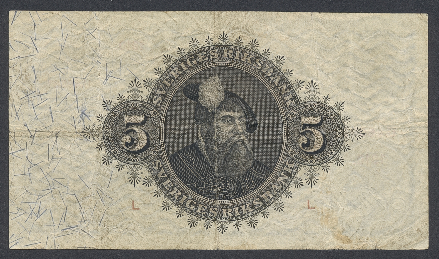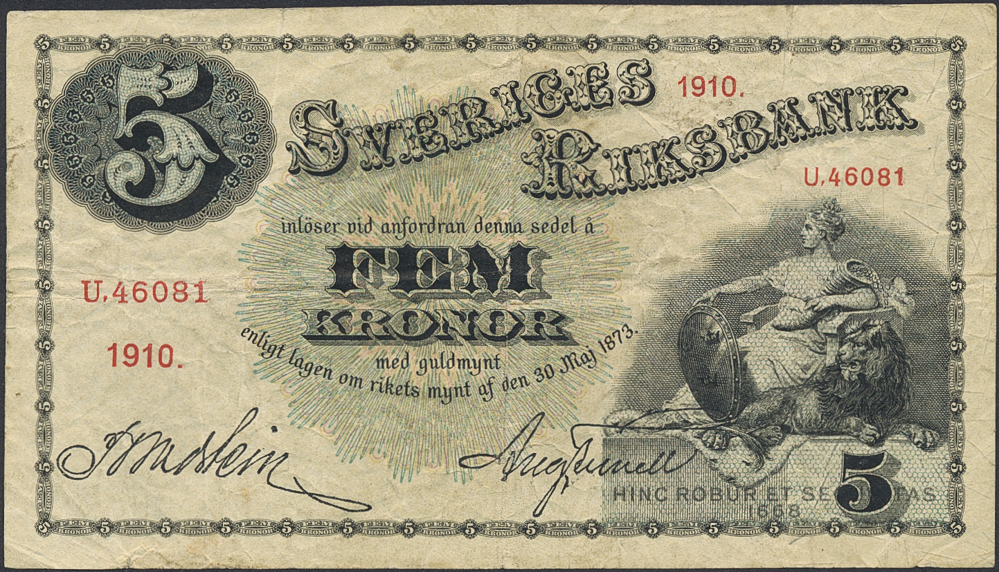 Banknotes, Sweden. SF Q6:5, 5 kronor 1910. Small tears. 1?/1.