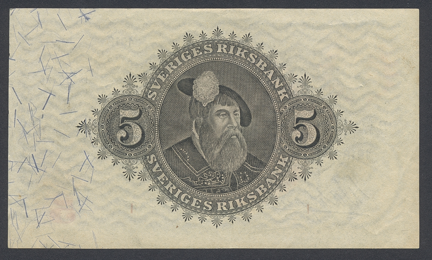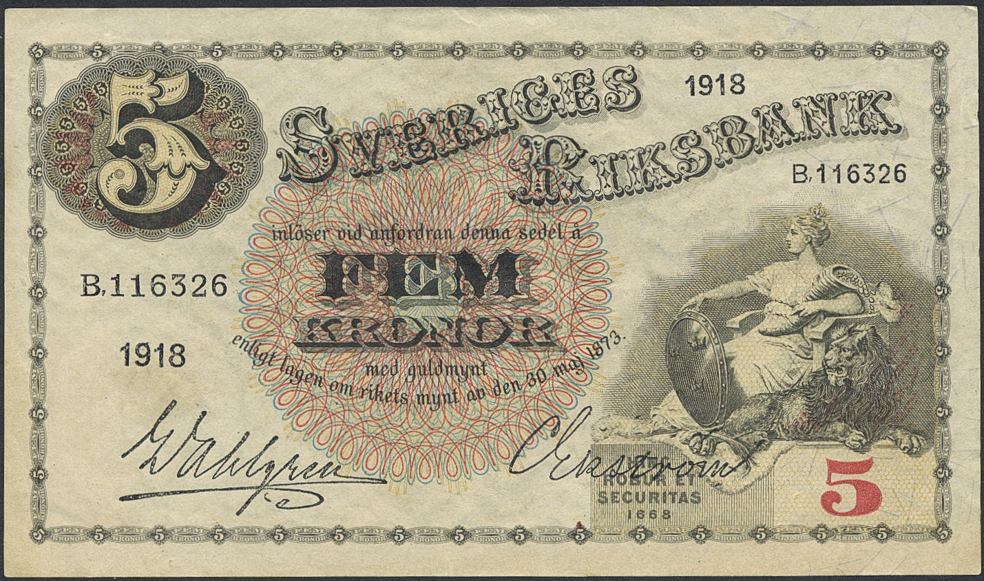 Banknotes, Sweden. SF Q7:1, 5 kronor 1918. B116326. Light centre fold and minor handling marks. 01.