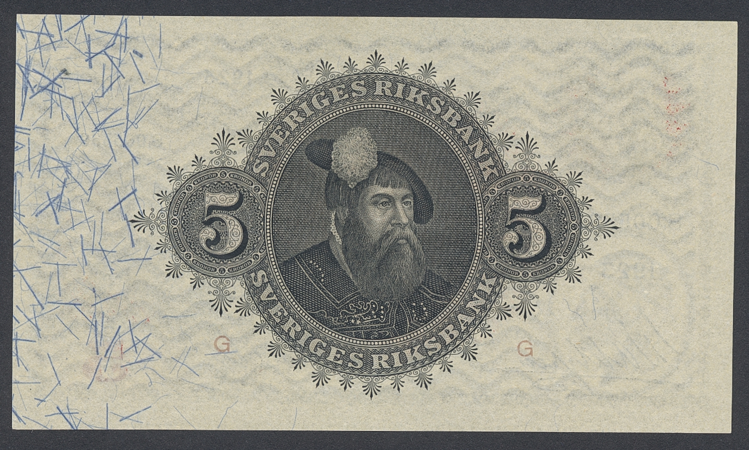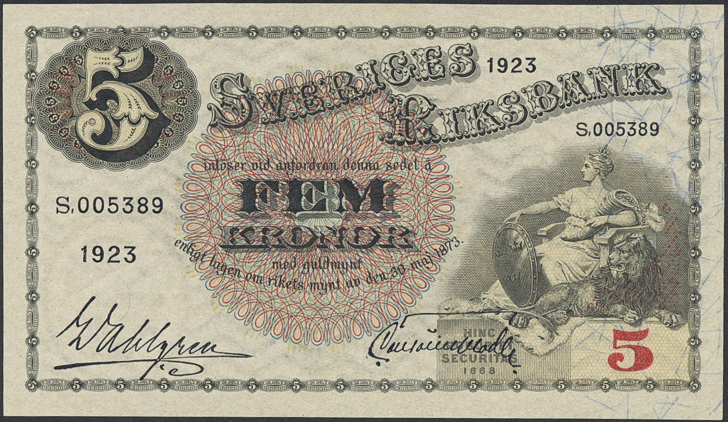 Banknotes, Sweden. SF Q7:6, 5 kronor 1923. S005389. Light centre fold. 01.