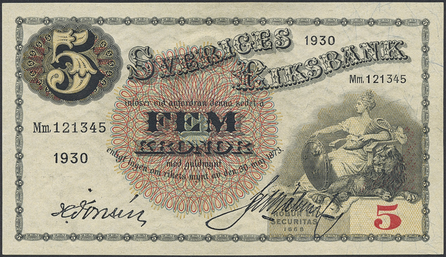 Banknotes, Sweden. SF Q7:13, 5 kronor 1930. Mm121345. Not folded. Minor handling marks. 01/0.