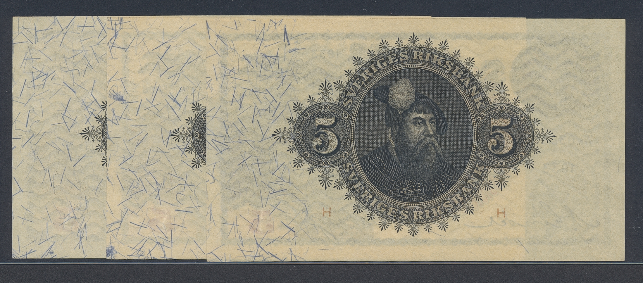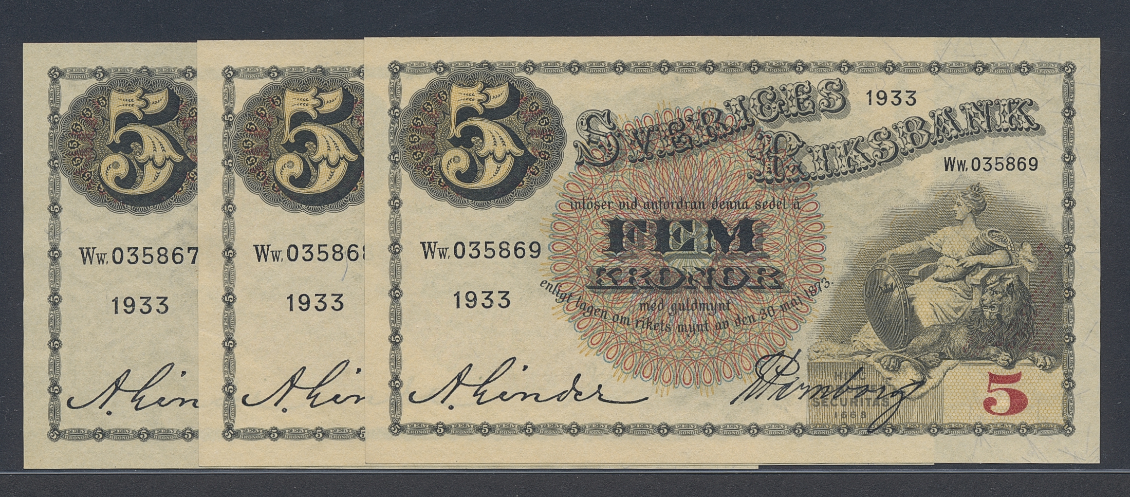 Banknotes, Sweden. SF Q7:16, 5 kronor 1933. Not folded, 3 pcs in consecetive numbers. 01/0.