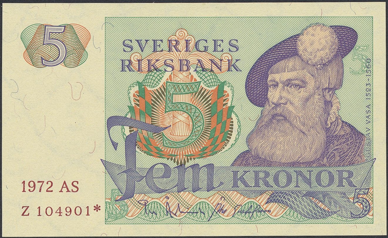 Banknotes, Sweden. SF Q11:11, 5 kronor 1972. Z104901*. Replacement note. Not folded. Scarce note with only 1000 printed. 0.