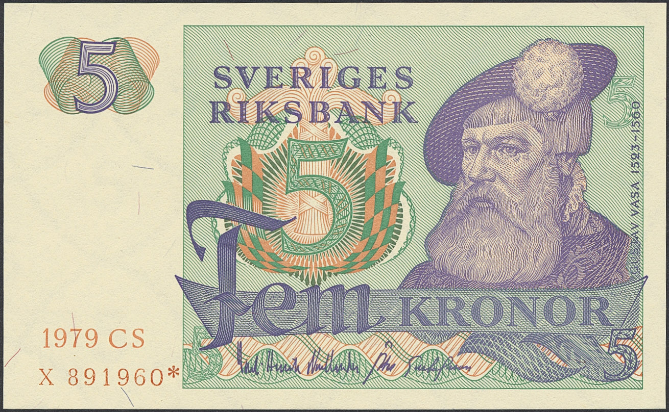 Banknotes, Sweden. SF Q11:20, 5 kronor 1979. Not folded, replacement. Only 8000 pcs were printed. 01/0.