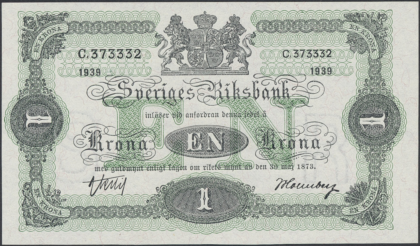Banknotes, Sweden. 1 krona 1939. C373332. Scarce emergency date during WW2 that was never meant for circulation. 0.