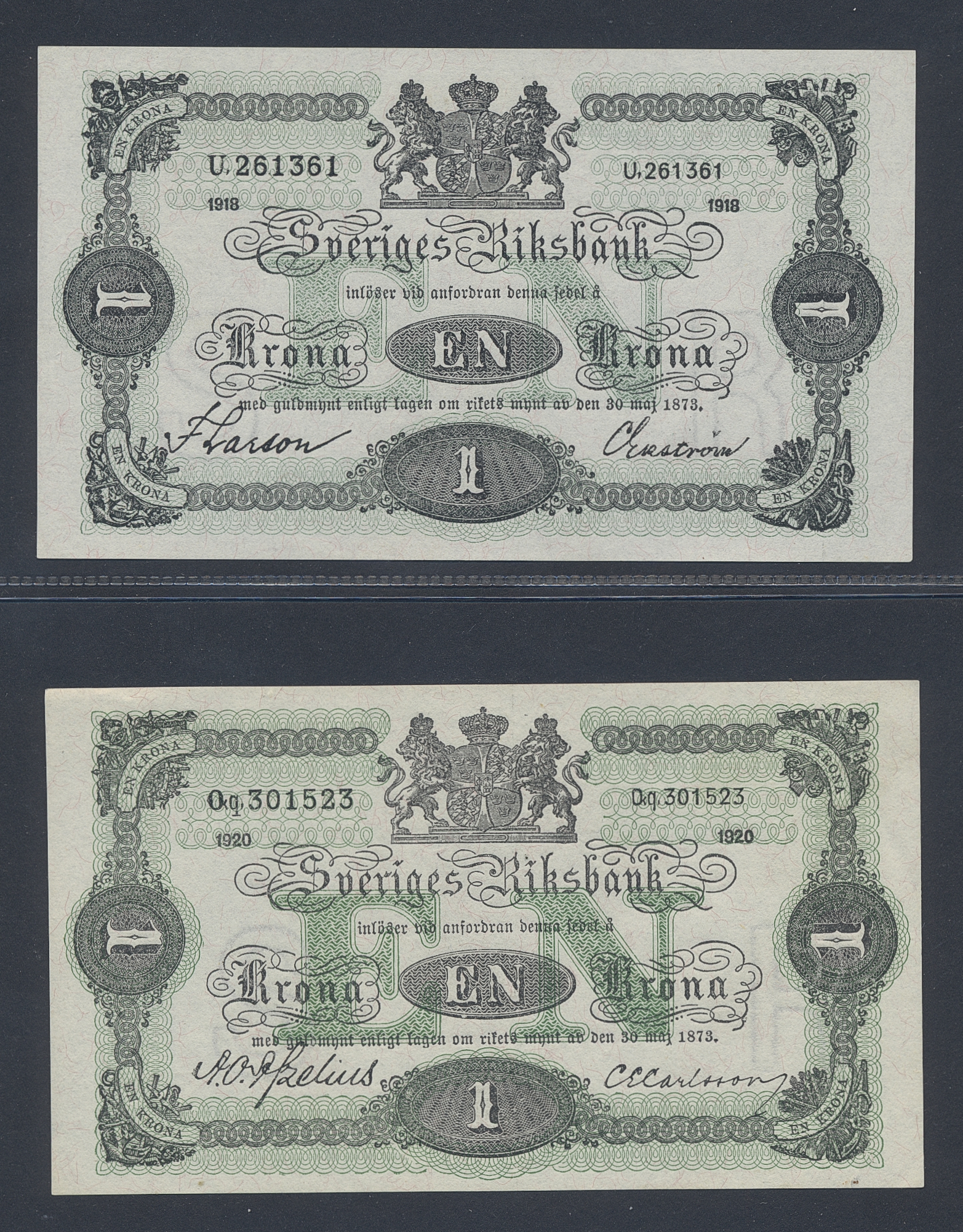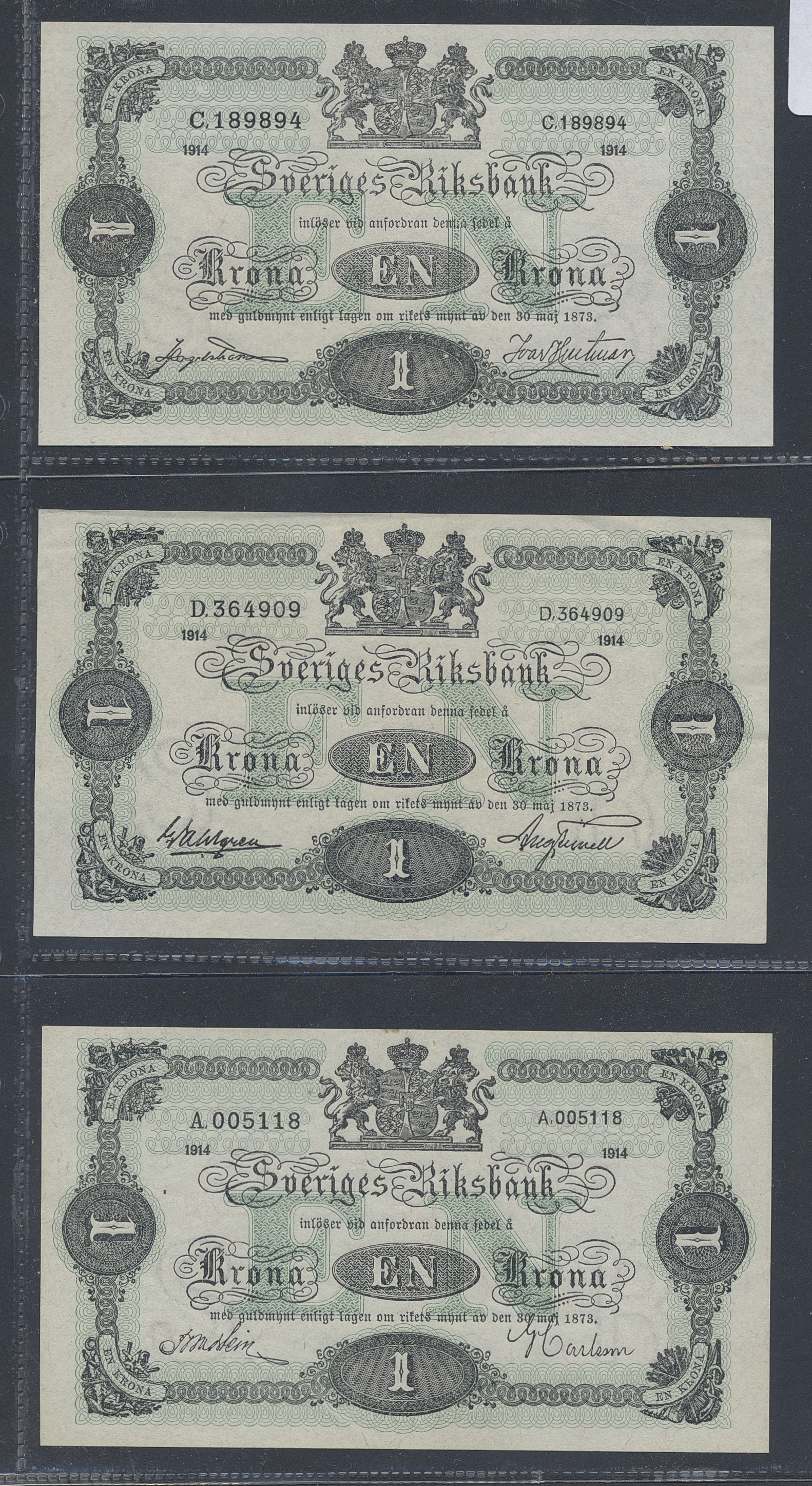 Banknotes, Sweden. 1 krona 1914 (five examples) and 1918 and 1920. All not folded, some with handling marks. Please inspect! 01-01/0.