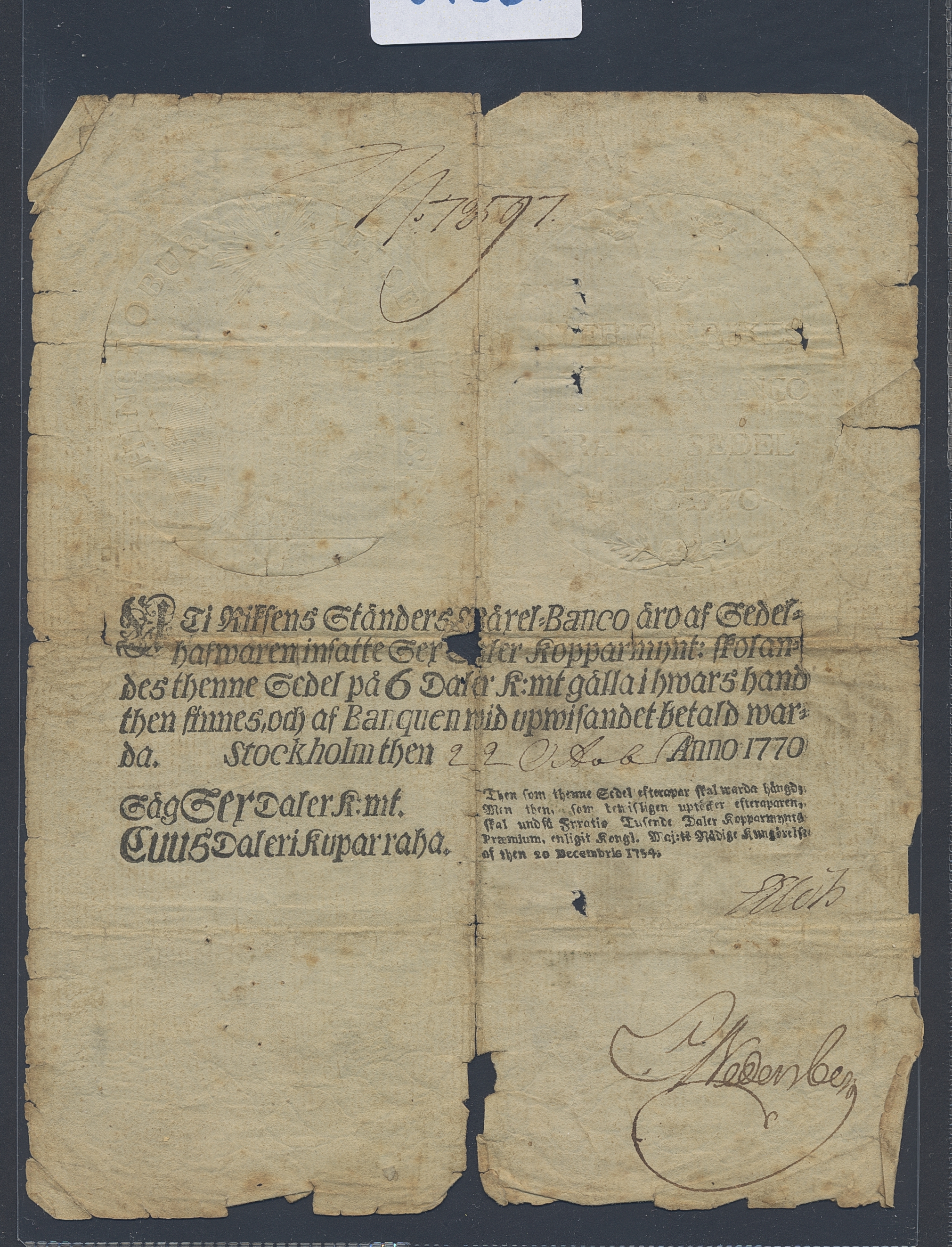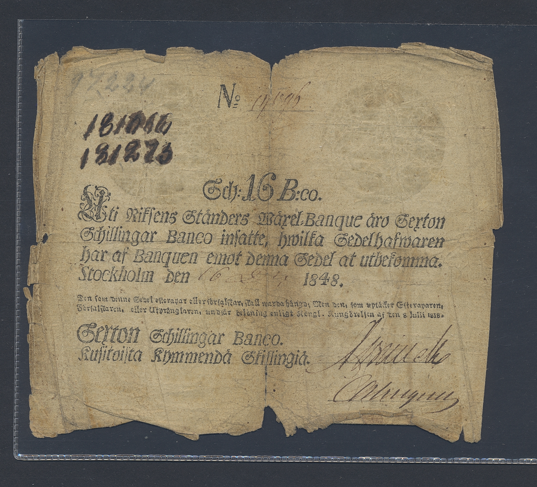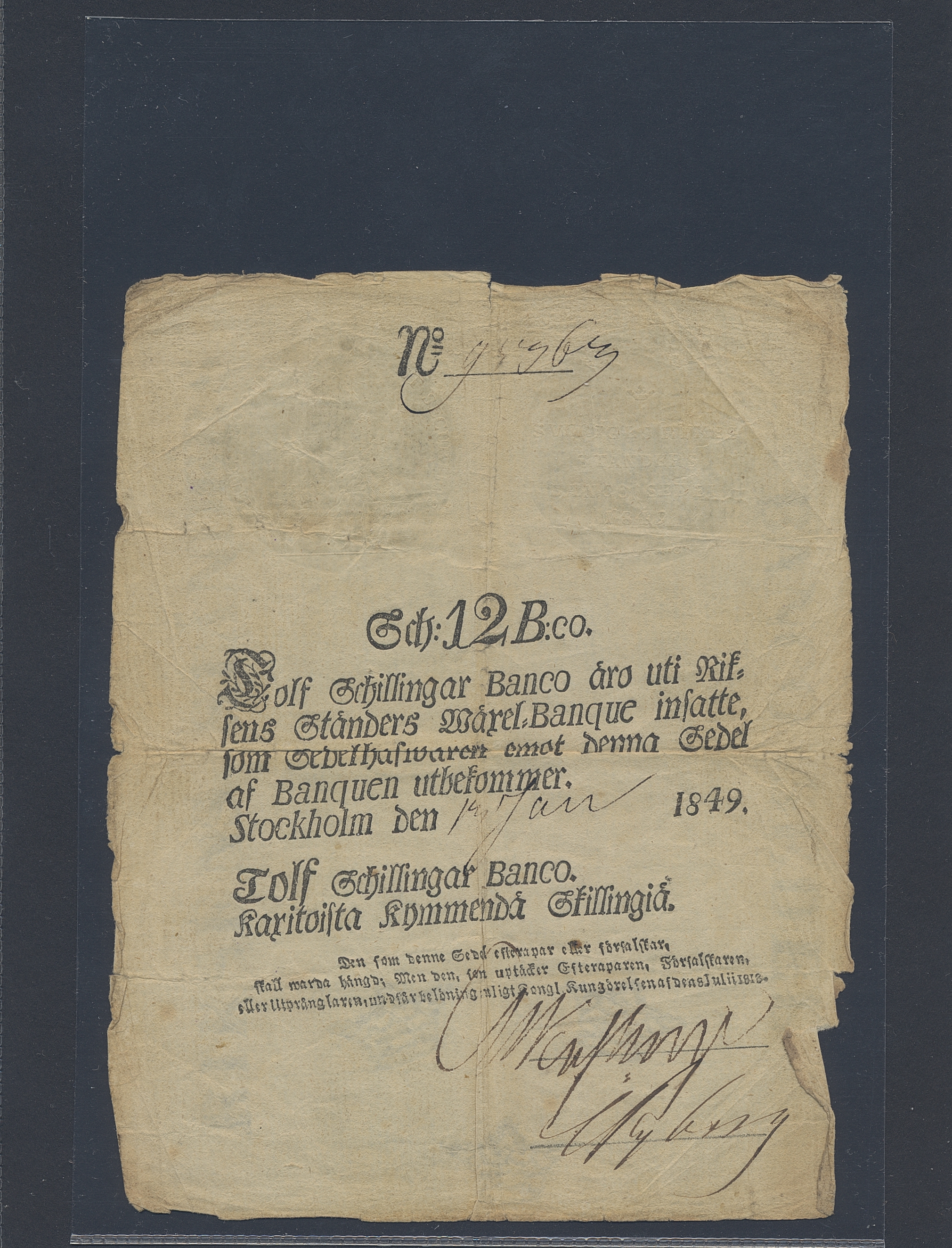 Banknotes, Sweden. Lot. 6 Daler Kopparmynt 1770, 16 Skilling Banco 1848 and 12 Skilling Banco 1849. 2/1?-1?