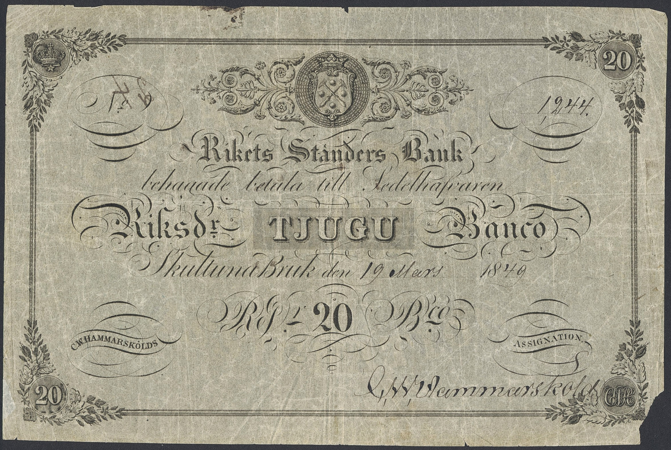 Private banknotes, Sweden. 20 riksdaler banco. No 1244. Dated 19 Mars 1849. Small tear and paper loss in lower right corner. 1.