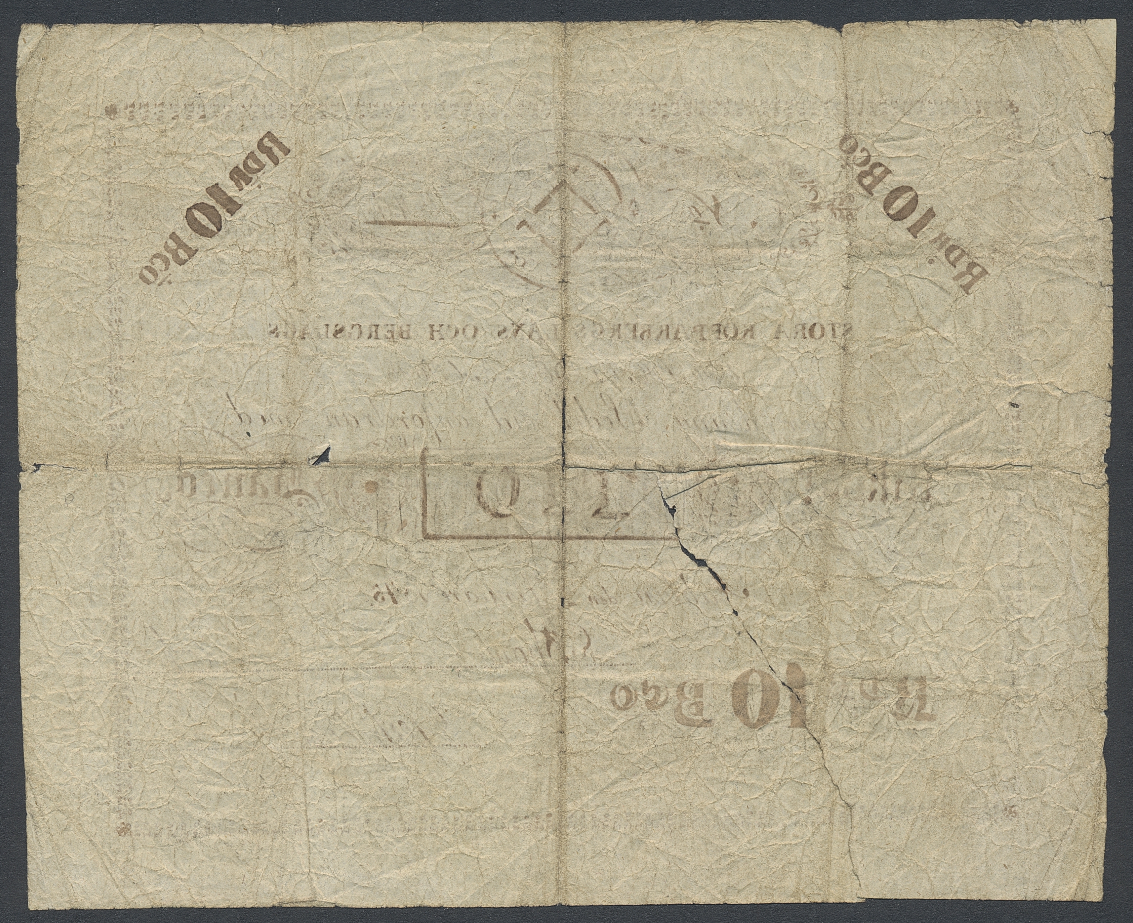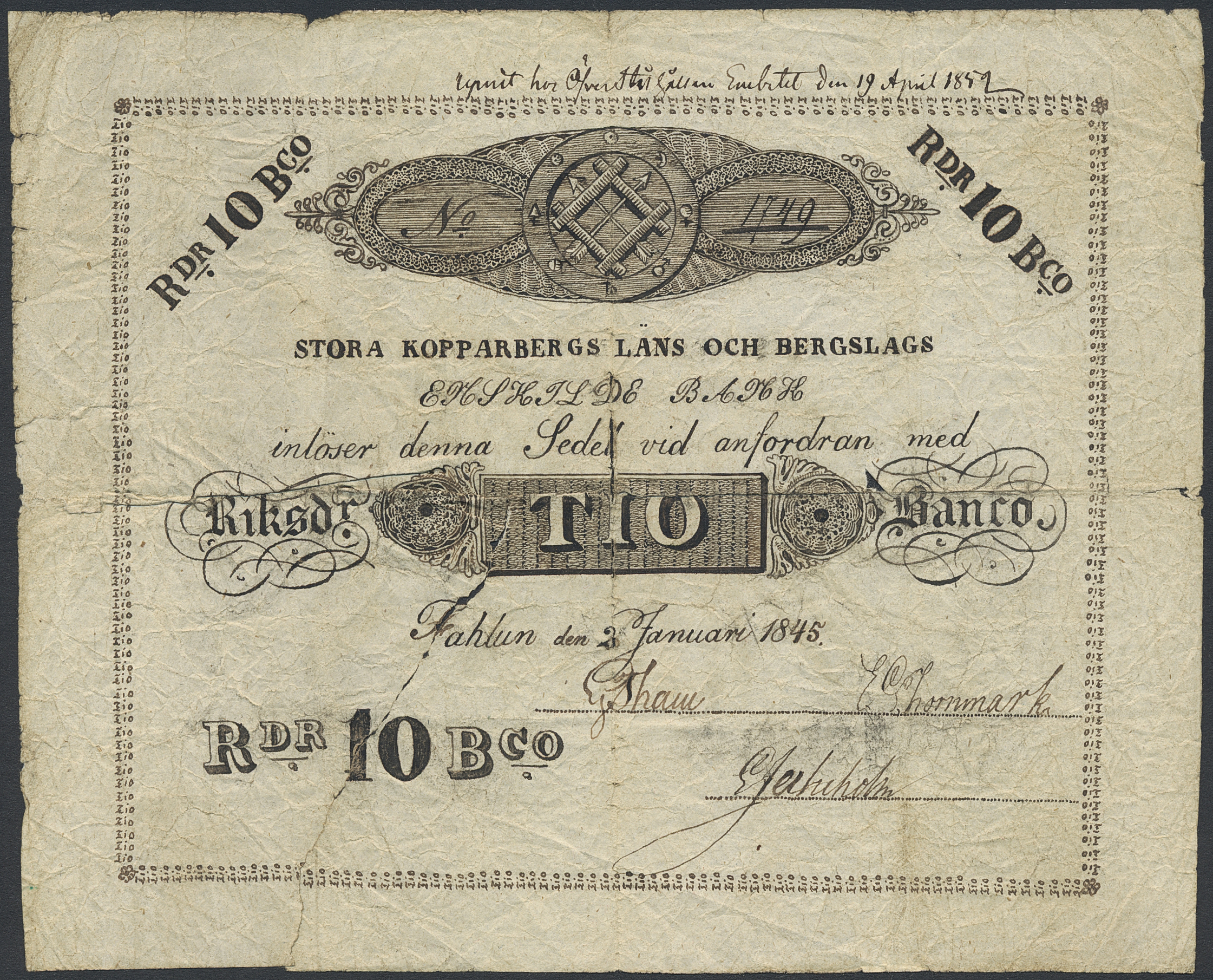 Private banknotes, Sweden. 10 riksdaler banco 1845. Contemporary forgery hand-made. Large tear to the centre of the note. 1?/1.