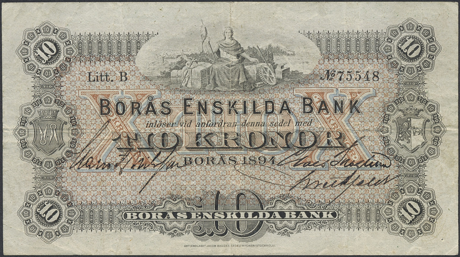 Private banknotes, Sweden. Platz 10, 10 kronor 1894. Litt B. No 75548. 1.