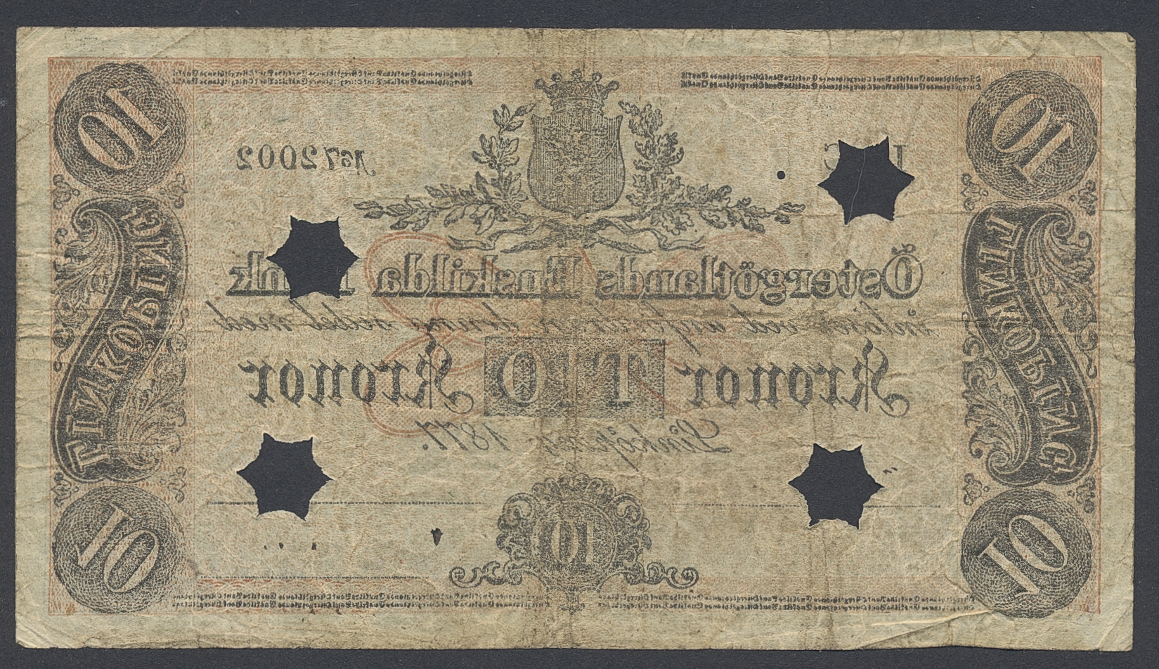 Private banknotes, Sweden. Platz 24, 10 kronor 1877. Litt C. No 72002. Cancelled by hole cancellation. 1.
