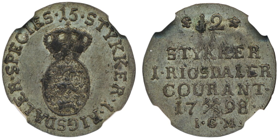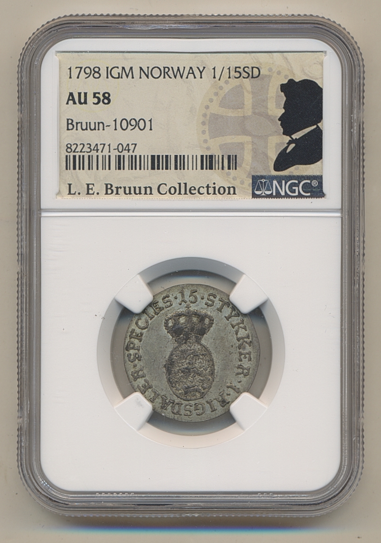 Coins, Norway. Christian VII, NM 68, 1/15 speciedaler 1798. 3.32 g. Lustrous example, somewhat weakly struck. Ex. Bruun. Graded by NGC as AU58. NMD 69. 01. See certification at NGC