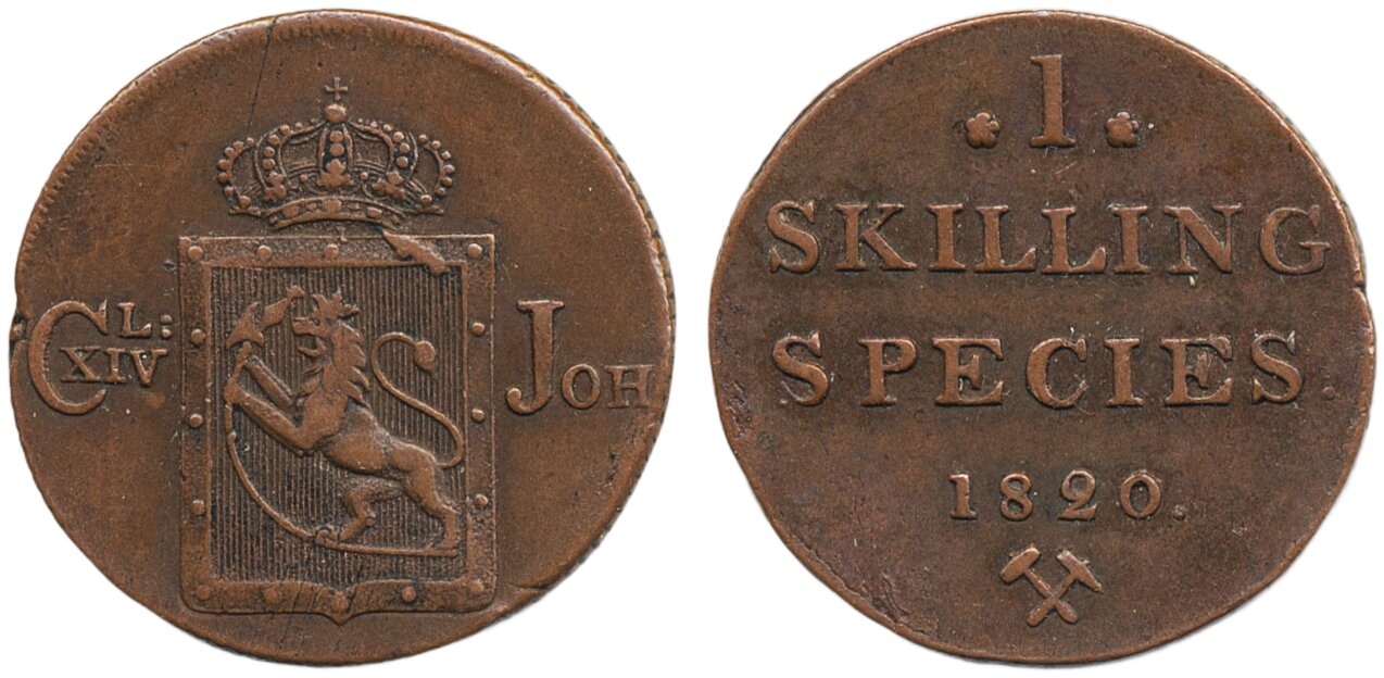 Coins, Norway. Karl XIV Johan, NM 59, 1 skilling 1820. 10.72 g. Minor planchet flaw at edge. 1+.