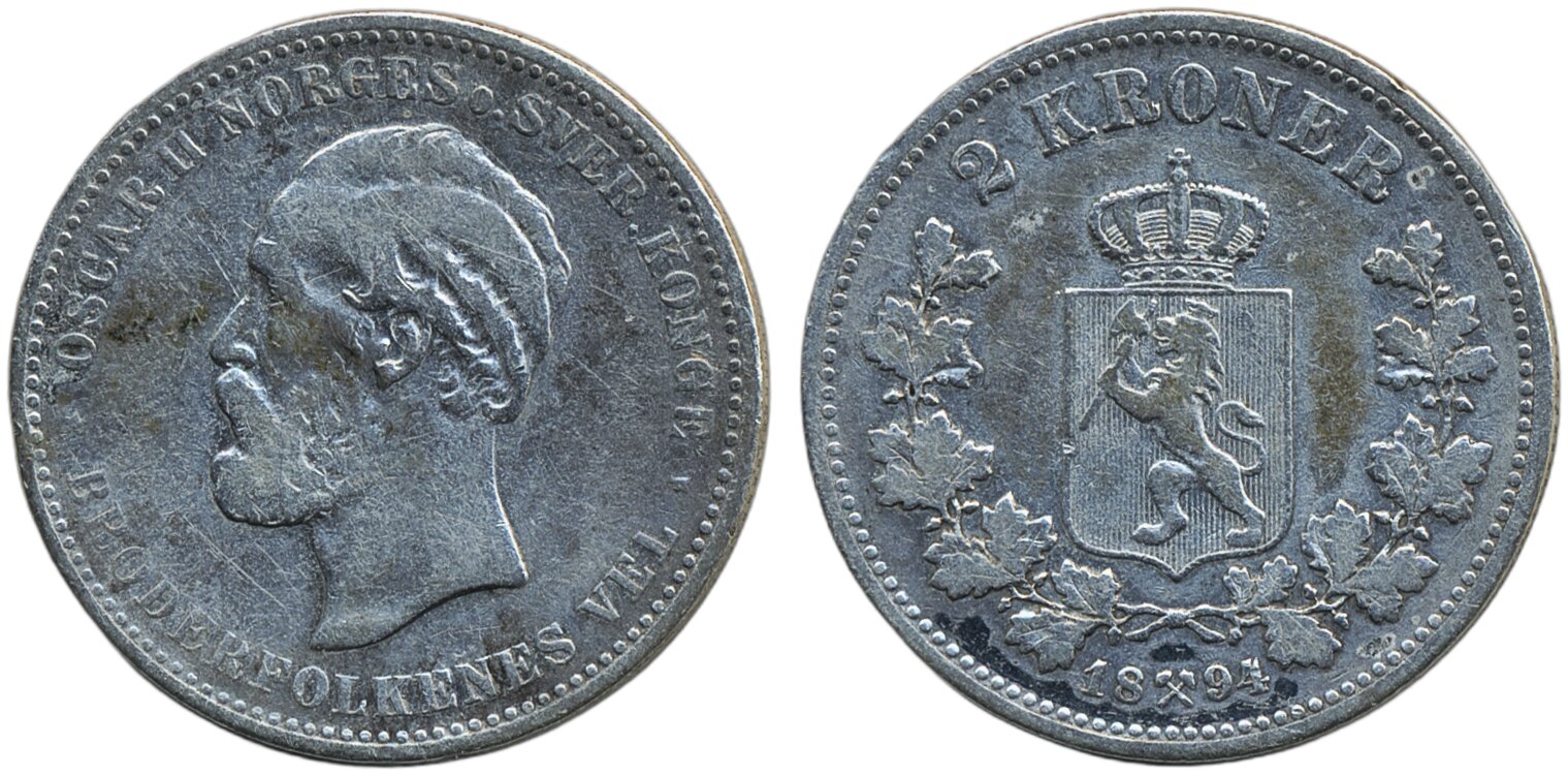 Coins, Norway. Oskar II, NM 24, 2 kroner 1894. Cleaned. 1?/1.