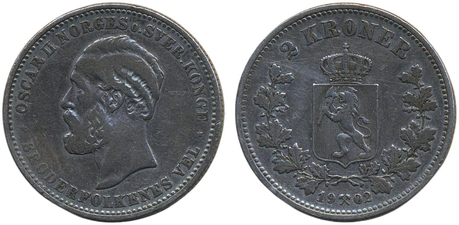 Coins, Norway. Oskar II, NM 28, 2 kroner 1902. 1+.