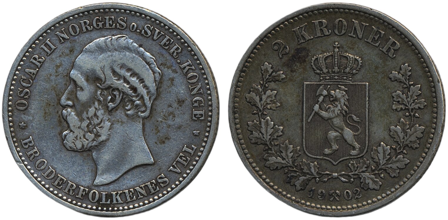 Coins, Norway. Oskar II, NM 28, 2 kroner 1902. Lightly cleaned. 1/1+.