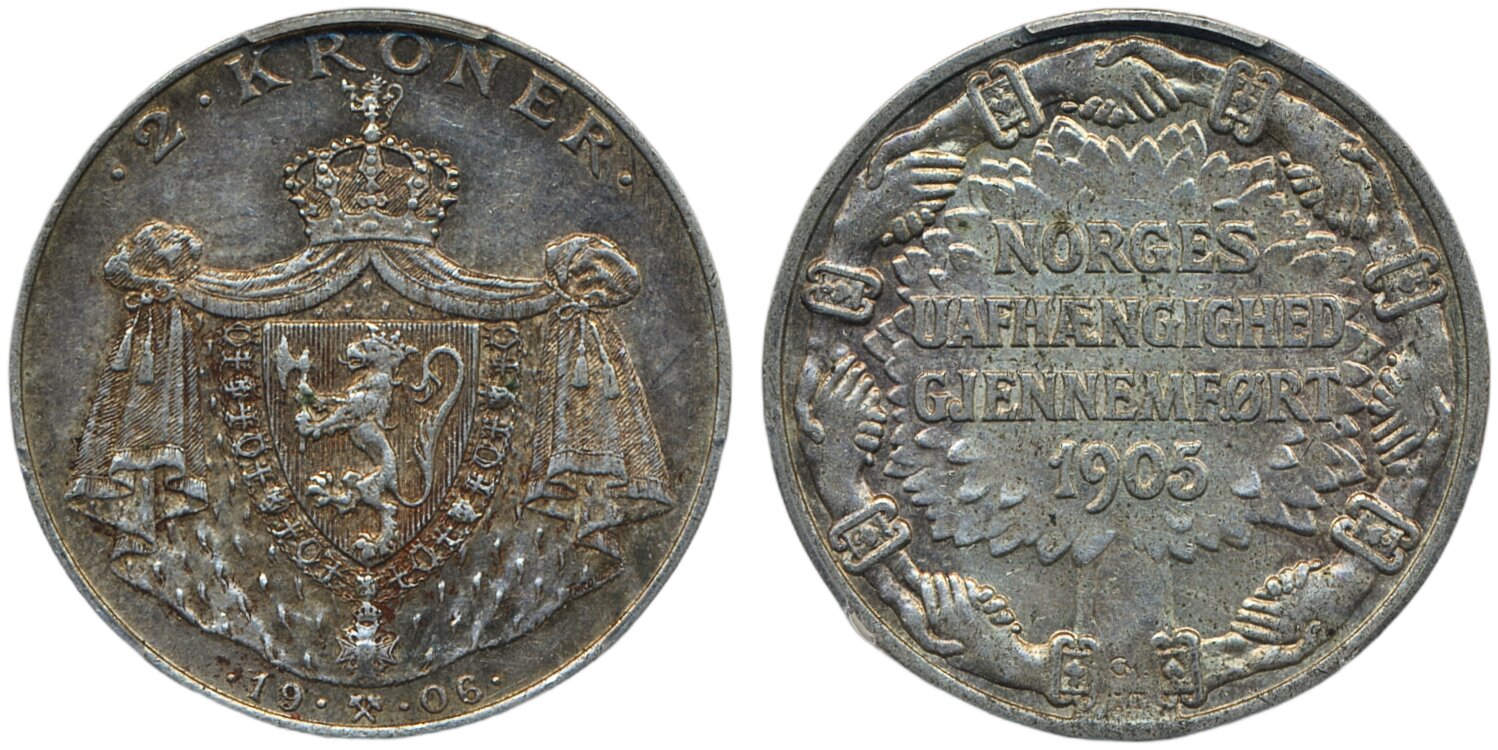 Coins, Norway. Haakon VII, NM 3, 2 kroner 1906. Commemorative issue to Independence. Beautifully toned. Graded by PCGS as MS62. 01. See certification at PCGS