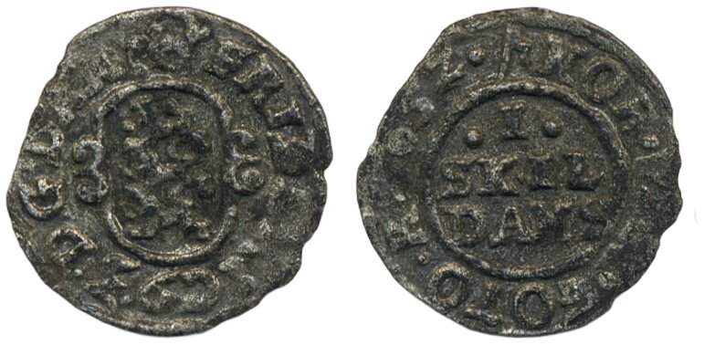 Coins, Denmark. Frederik III, Sieg 6.2 (Hede 131), 1 skilling 1652. 0.80 g. Light corrosion. 1+.
