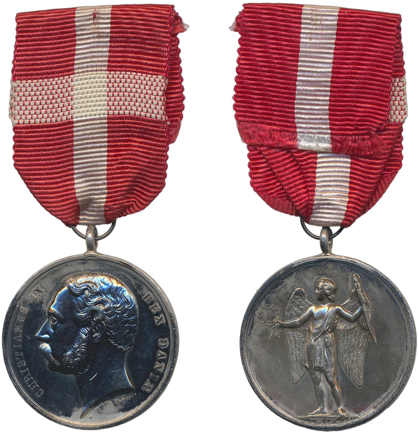 Medals, regal, Denmark. Christian IX, Silver medal Ingenio et Arti with original ribbon, 20.43 g with ribbon. Obverse stained, reverse lustrous. 1+/01.