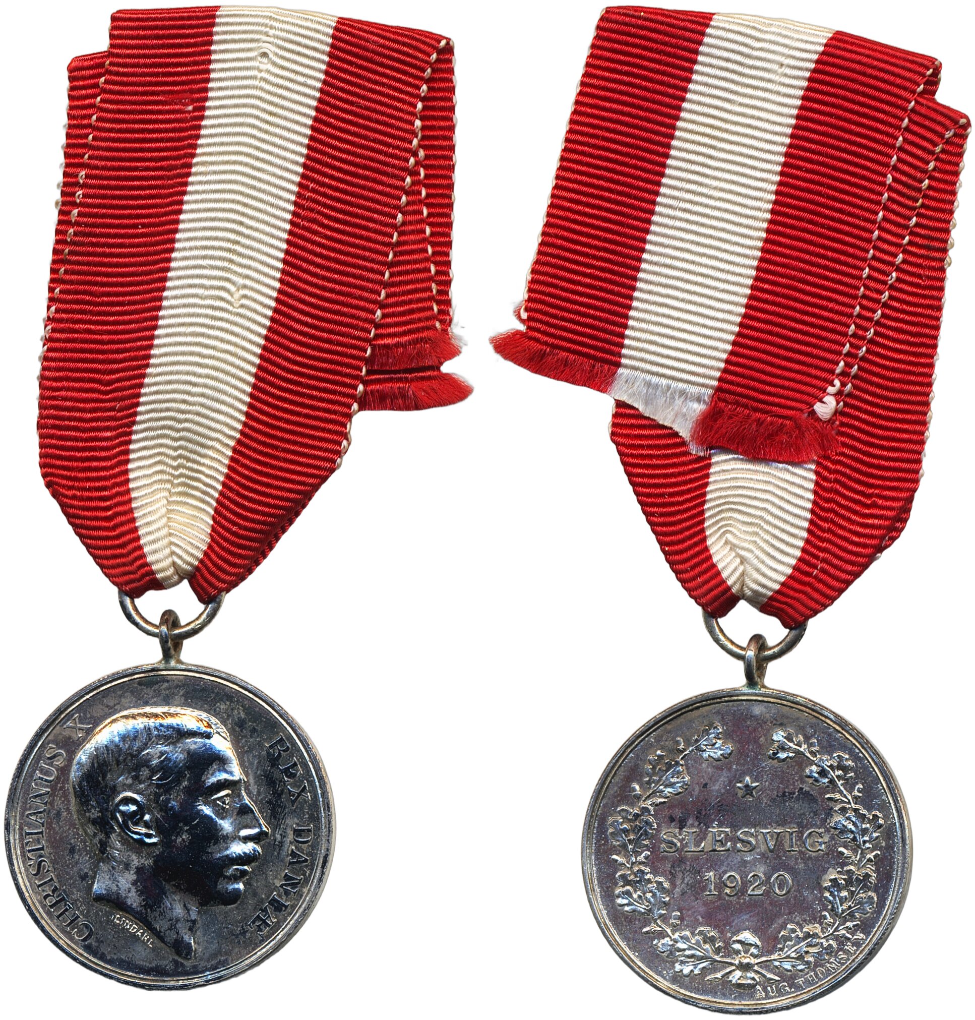 Medals, regal, Denmark. Christian X, Silver medal with original ribbon, on reverse SLESVIG 1920. 12.42 g with ribbon. Awarded to individuals who were of any rank that rendered services to the referendum of 1920 that returned Schleswig to Denmark. 1500 medals were awarded. 01.