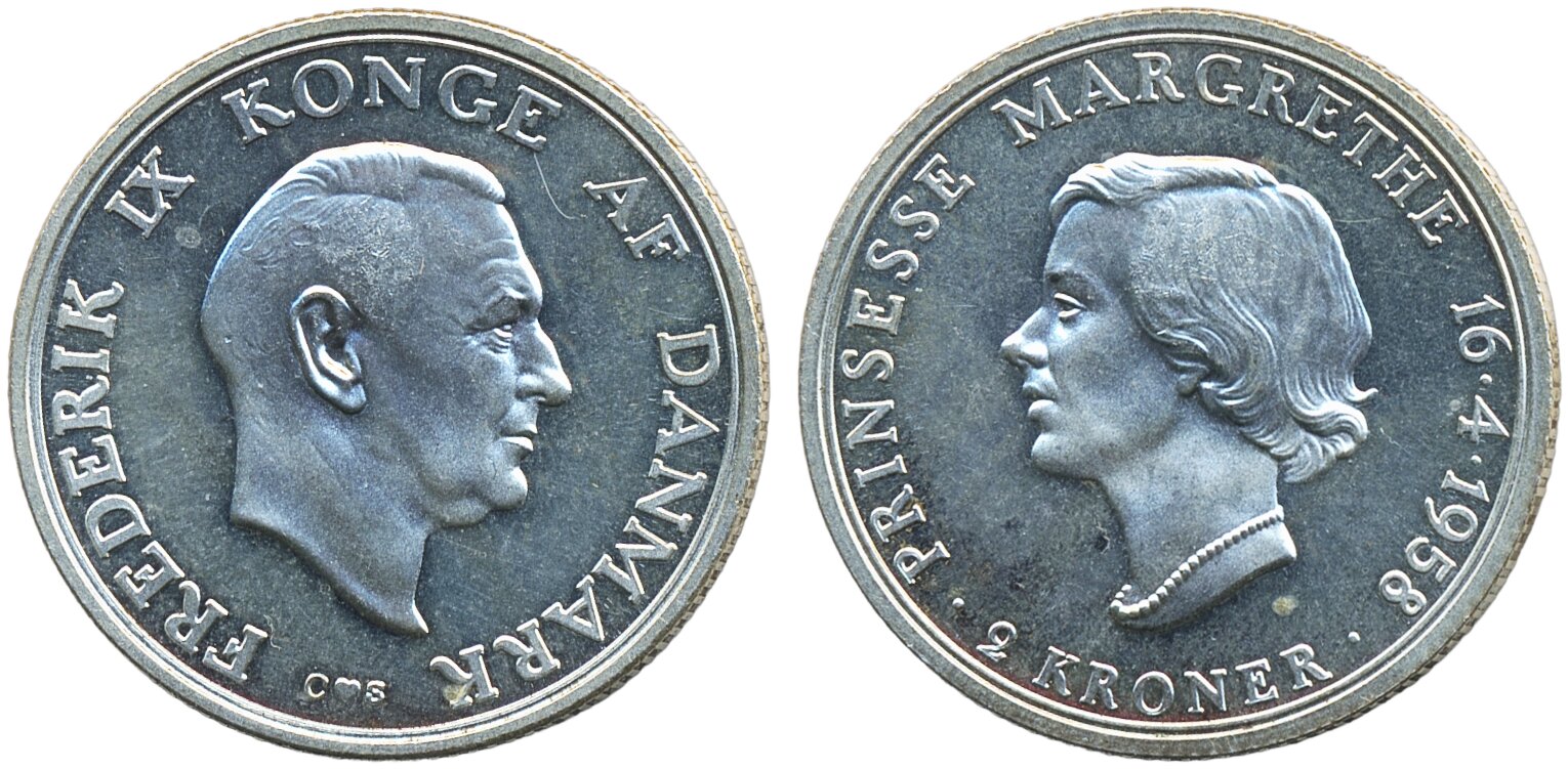 Coins, Denmark. Frederik IX, Sieg 11, 2 kroner 1958. Superb example with prooflike surfaces. 01/0.