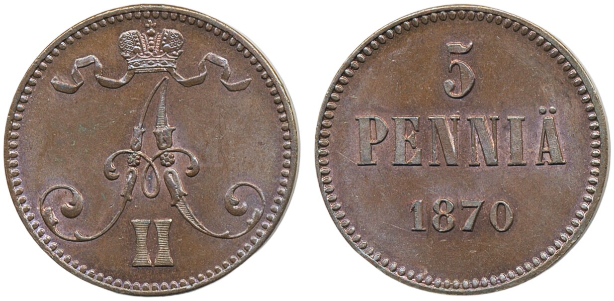 Coins, Finland. Alexander II, KM 4.1, 5 penniä 1870. Beautiful lustrous example. 01/0.