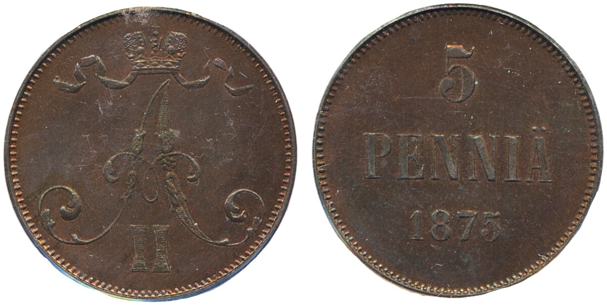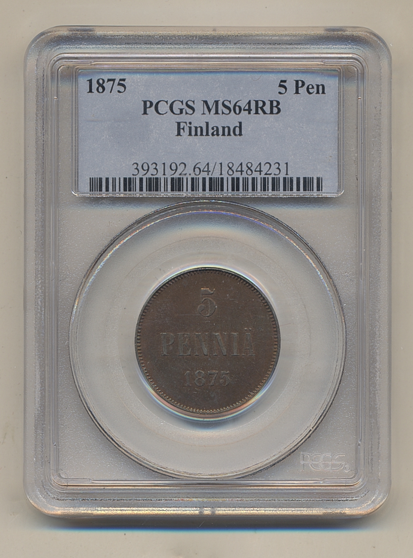 Coins, Finland. Alexander II, KM 4.2, 5 penniä 1875. Graded by PCGS as MS64RB. Bitkin 663. 01/0. See certification at PCGS