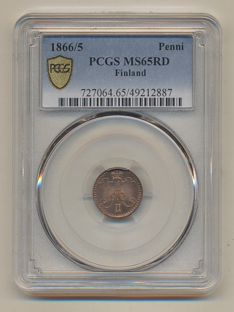 Coins, Finland. Alexander II, KM 1.1, 1 penni 1866/5. Scarce overdate. Full red mint lustre. Graded by PCGS as MS65RD. We note a raw uncirculated example selling in Holmasto auction 165 lot 29 (2023 Oct 7) for €2200+%. 0. See certification at PCGS
