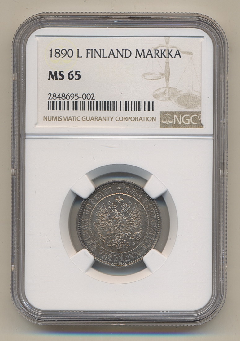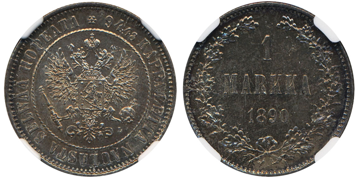 Coins, Finland. Alexander III, KM 3.2, 1 markka 1890. Graded by NGC as MS65. Bitkin 230. 01/0. See certification at NGC
