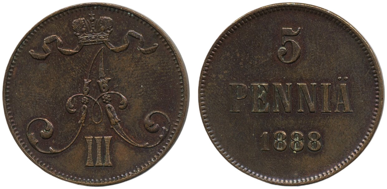 Coins, Finland. Alexander III, KM 11, 5 penniä 1888. 1+.