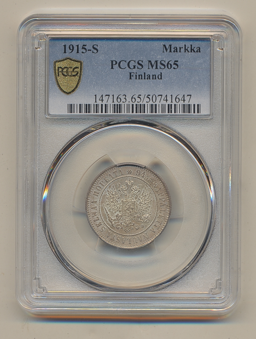 Coins, Finland. Nicholas II, KM 3.2, 1 markka 1915. Graded by PCGS as MS65. Bitkin 401. 01/0. See certification at PCGS