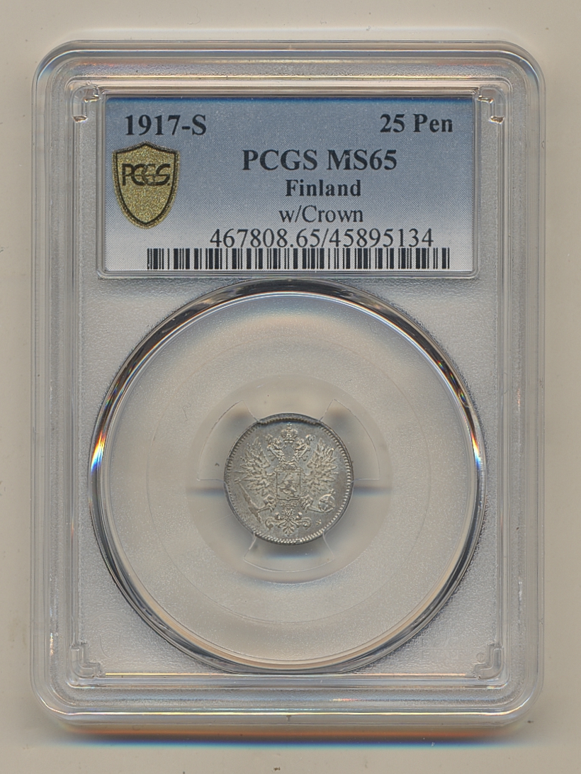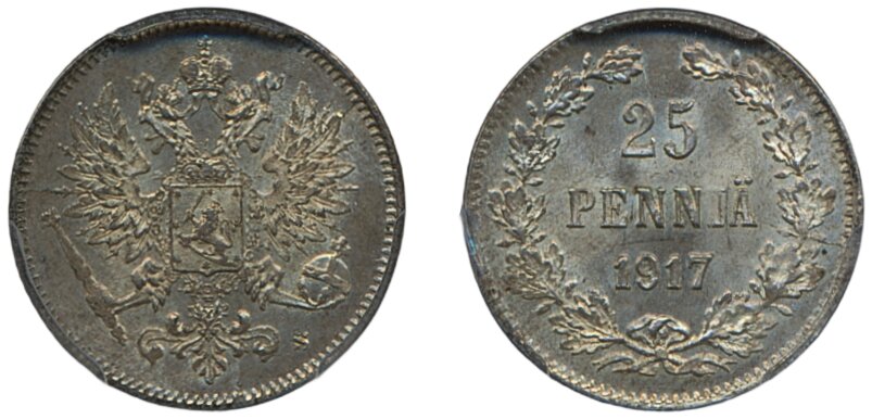 Coins, Finland. Nicholas II, KM 6.2, 25 penniä 1917. Graded by PCGS as MS65. Bitkin 422. 01/0. See certification at PCGS