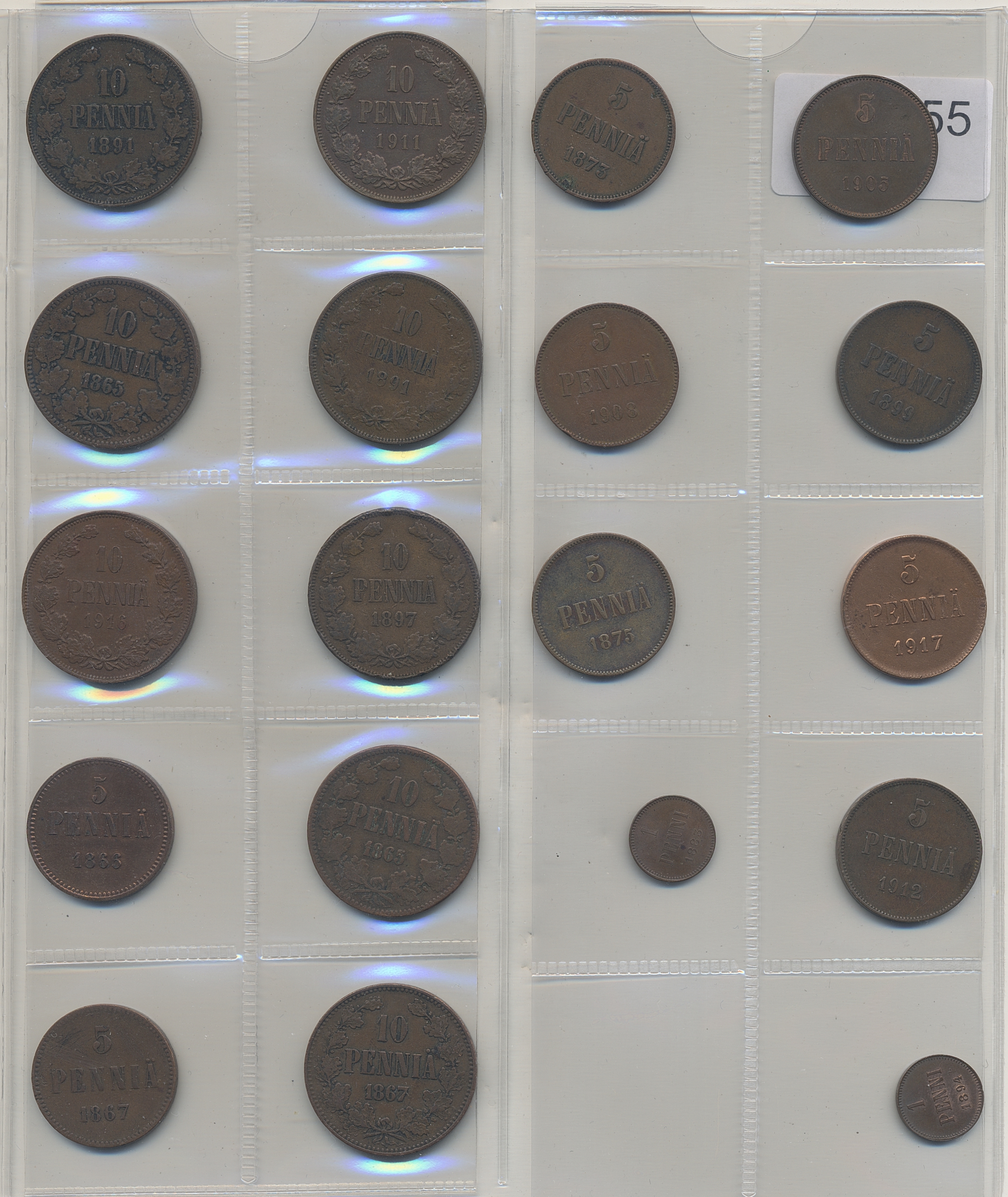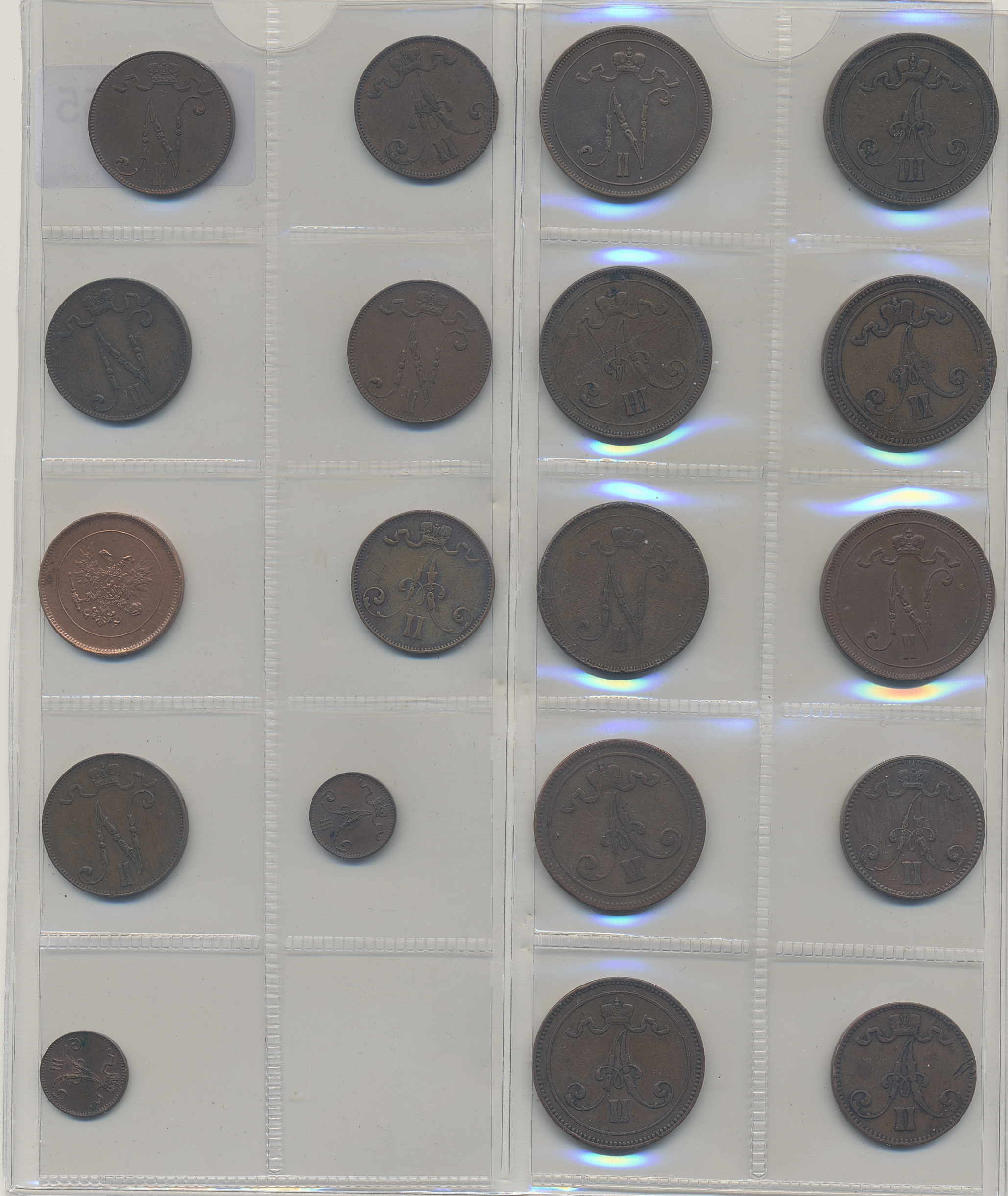 Coins, Finland. Small lot of Finnish copper coins. In total 19 pcs including lustrous 5 penniä 1905 and 1 penni 1883 and 1894. 1-01.