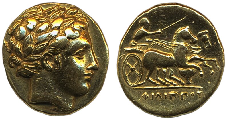 Coins, Ancient, Greek coins. Macedon. Philip II (359–336 BC). Gold Stater, 8.47 g. Pella. ca. 340/336–328 BC. Laureate head of Apollo right, with short curly hair / Charioteer, holding goad, driving galloping biga right, trident right below horses. SNG.ANS-138. Beautiful example. Ex. Soler y Llach, Barcelona. VF-XF.