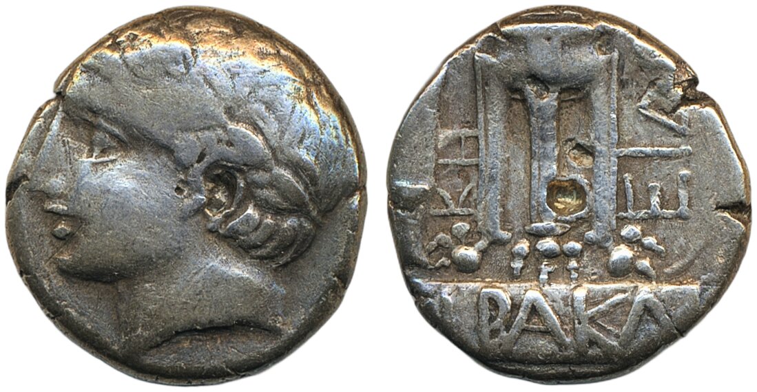 Coins, Ancient, Greek coins. Illyria, Damastion. Tetradrachm, 13.10 g. Laureate head of Apollo facing left / Tripod with lions feet on broad, inscribed base. SNG Cop 553, Ahsmolean 3320. Ex. Bruun Rasmussen. F-VF.