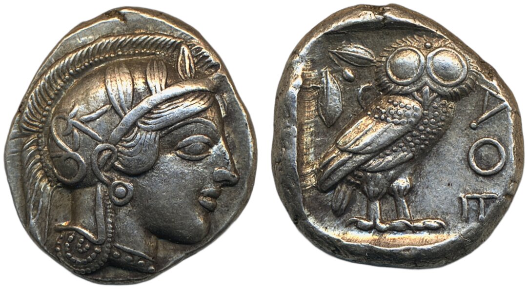 Coins, Ancient, Greek coins. Athens, Attica. (After 449 BC).Tetradrachm, 17.19 g. Helmeted head of Athena right / Owl standing right, olive sprig and crescent above. High relief, beautifully toned. Ex. G. Hirsch Nachfolger. Good XF.