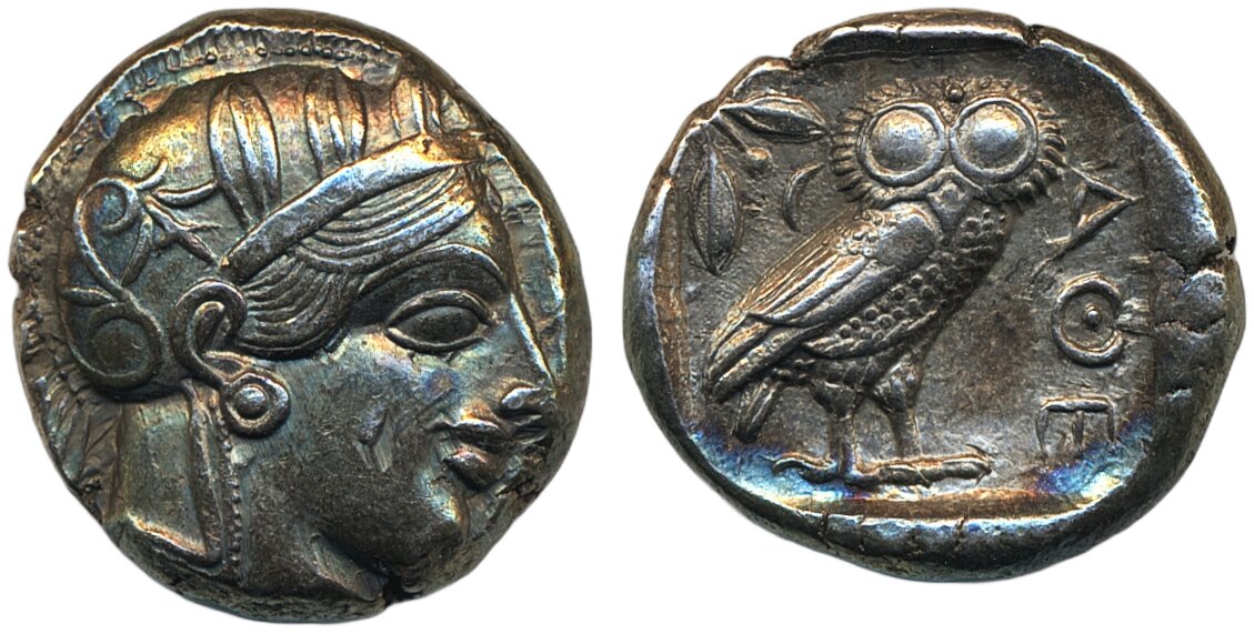 Coins, Ancient, Greek coins. Athens, Attica. (ca. 454–405 BC).Tetradrachm, 17.16 g. Helmeted head of Athena right / Owl standing right, olive sprig and crescent above. High relief. Kroll 8, SNG Cop. 31. Scratch on cheek, otherwise a beautiful example with lovely rainbow patina! Ex. Ibercoin S.L., Madrid. Good VF/XF.